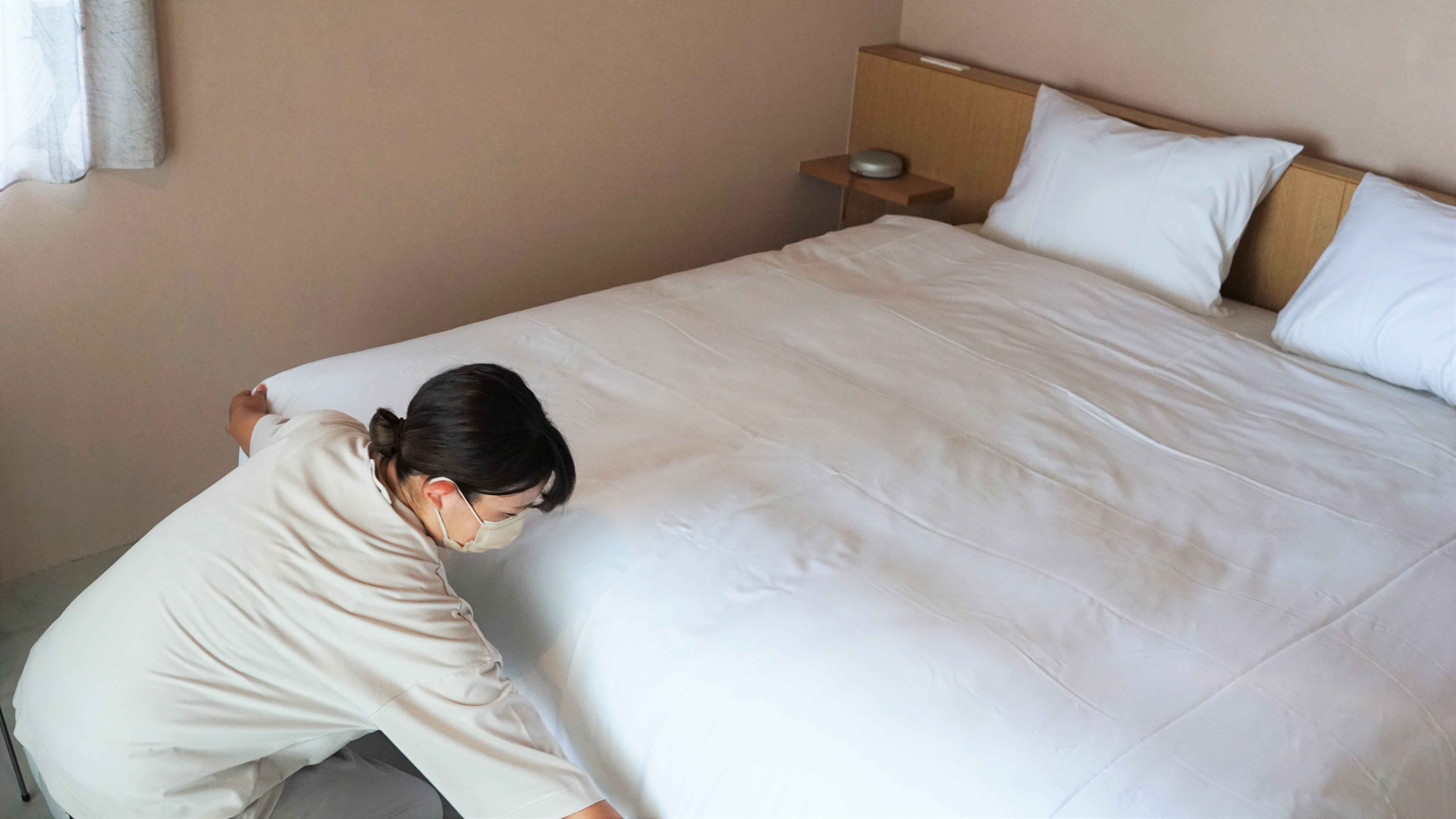 NELLのマットレスは、通常サイズより大きいためシーツを綺麗にセットするのも一苦労なのですが、どうすれば綺麗にまとめられるかをスタッフみんなで話し合い、試し、繰り返し..。