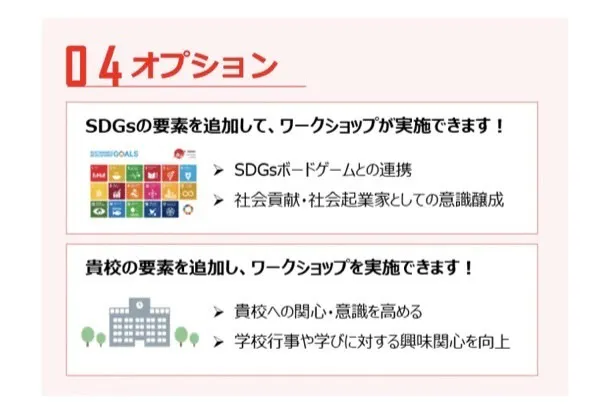 そのような社会を生き抜いていく若者たちだからこそ、将来“起業”という選択肢もあること、起業することは決してハードルが高いものではないことをこのワークショップを通して、起業へのプロセスを分かりやすく手軽に学んでほしい!と願い、1年の製作期間経て完成させました。