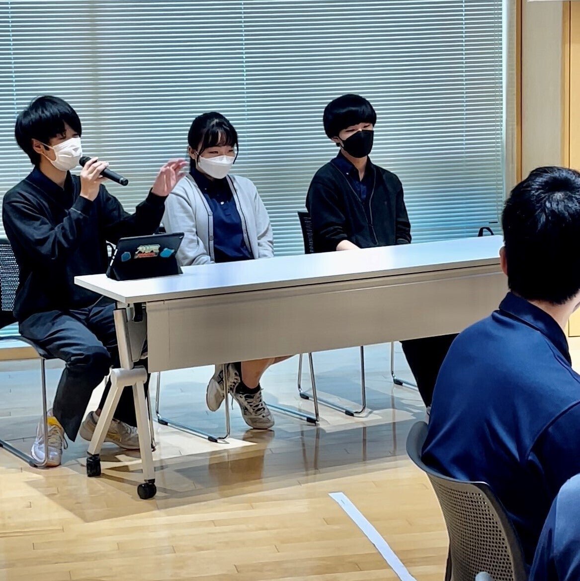 第1期生の優勝会社であるMOT社創業メンバーの生徒3名から、仲間と探究をする楽しさや苦労、自分たちがつくった会社のビジネスモデルを話していただき、2期生の生徒達は身近な先輩達から刺激を受けていました。