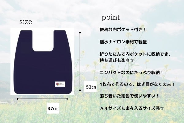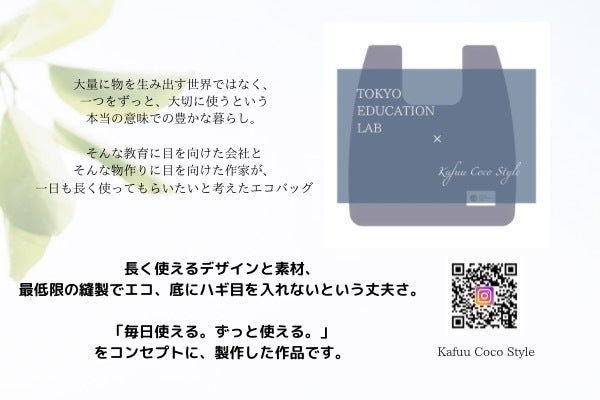「SDGsの取り組みは、これからの子どもたちの明るい未来のために、ファッション業界でも大切な 取り組みです。このエコバックは、長く使えるデザインと素材にこだわり、最低限の縫製でエコを実 現しています。底にハギ目を入れないことで叶う丈夫さで、「毎日使える。ずっと使える。」をコンセ プトに製作させていただきます。すべてハンドメイドでおつくりしますので、特別な“あなただけの 一点”をどうぞお楽しみください。