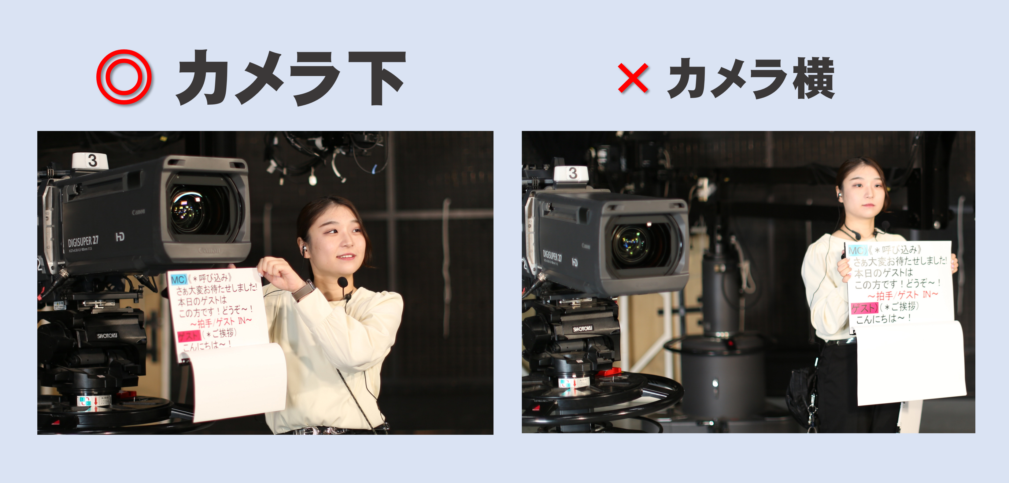 カメラの真下でカンペを出すことで、話し手の目線が泳ぐことはありません。