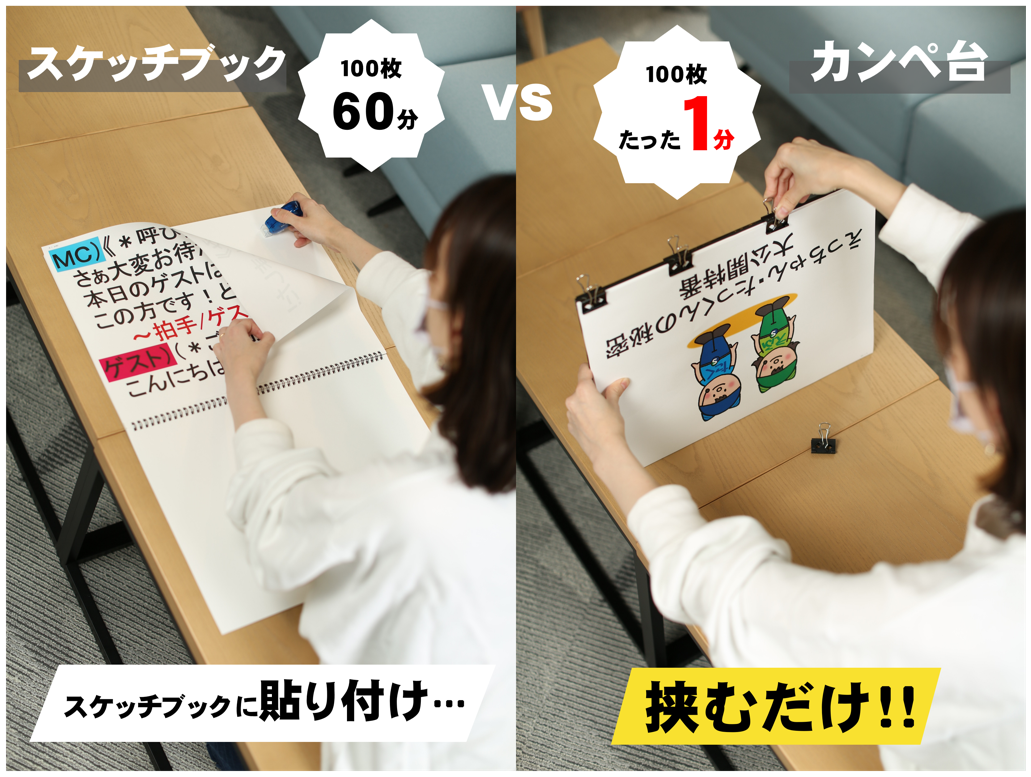 我が社の提案するカンペ台は「紙を挟んで持ちやすくする」というシンプルな構造なので、