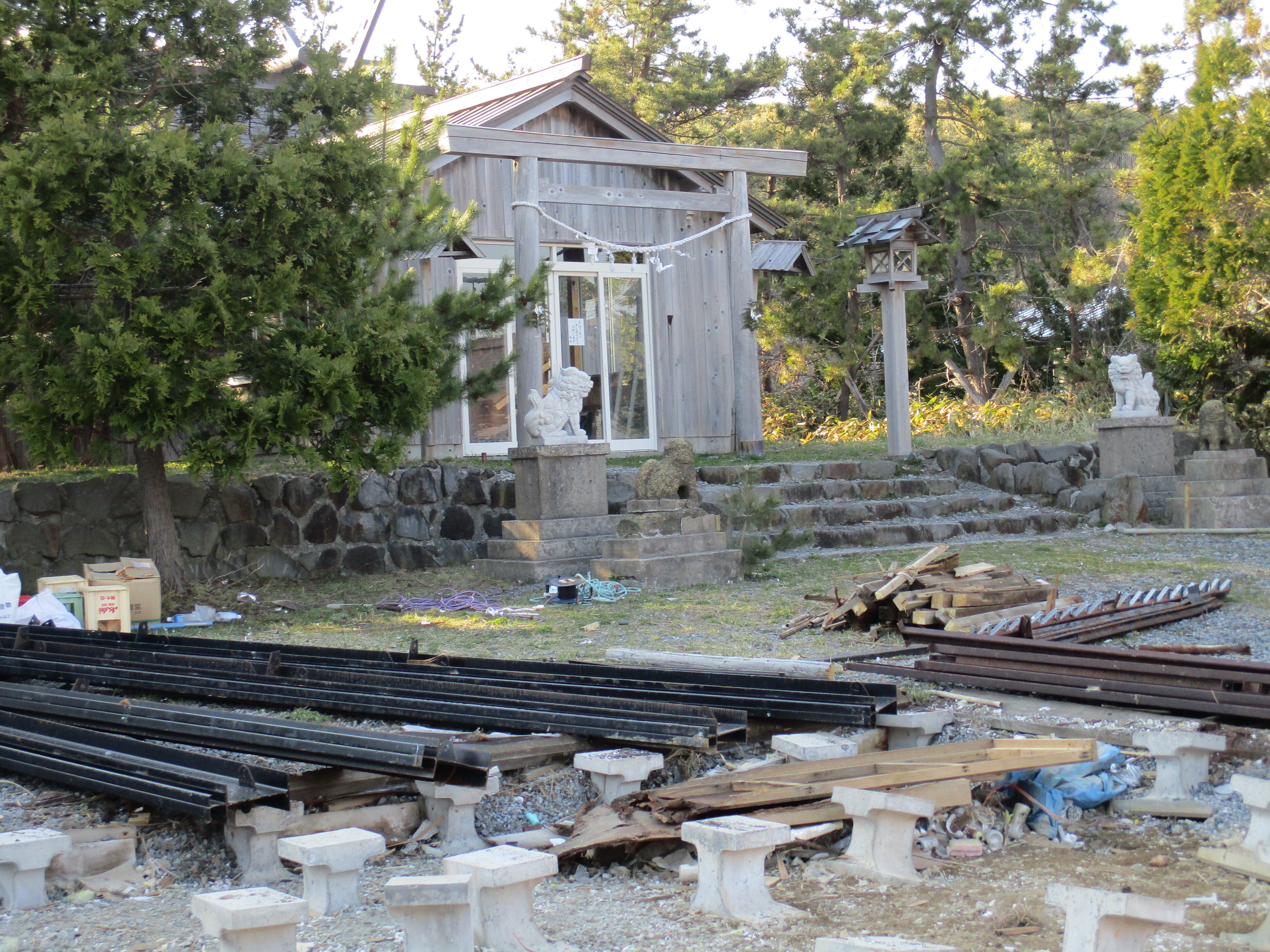 こんにちは、今の青苗の事代主神社です、解体の廃棄物処理が進められてます。5月の完成を目指しています。後3日の活動報告を残すところになりました。奥尻島は凄くいい天気に恵まれてます、春の陽気です。明上雅孝。