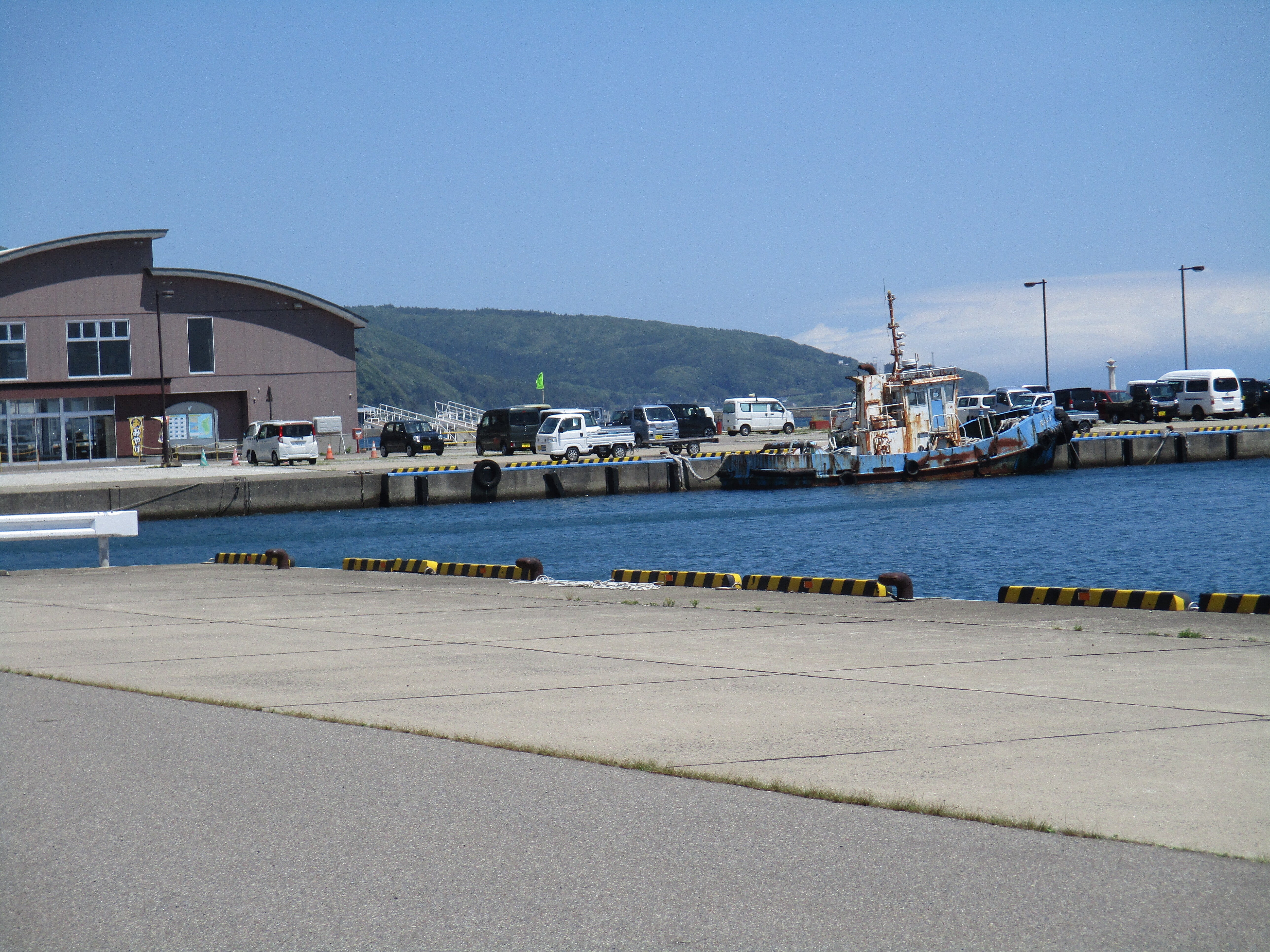 こんにちは、フェリーターミナルが見えています。建物の2階には、お土産店と、食事処があります。近くには海産物のお店もあります。8月は1日2便体制なので日帰りできますフェリーです。江差までは61Kあり130分で走ります。3600トン。車は40台積めます。料金は高く感じます。島にはレンタカーは30台はあります。ほとんどが軽四です。道路が狭いので便利ですよ。島の周囲は84Kですが車は66Kぐらい回れます。3時間ほどで観光は完了出来ます。明上雅孝。
