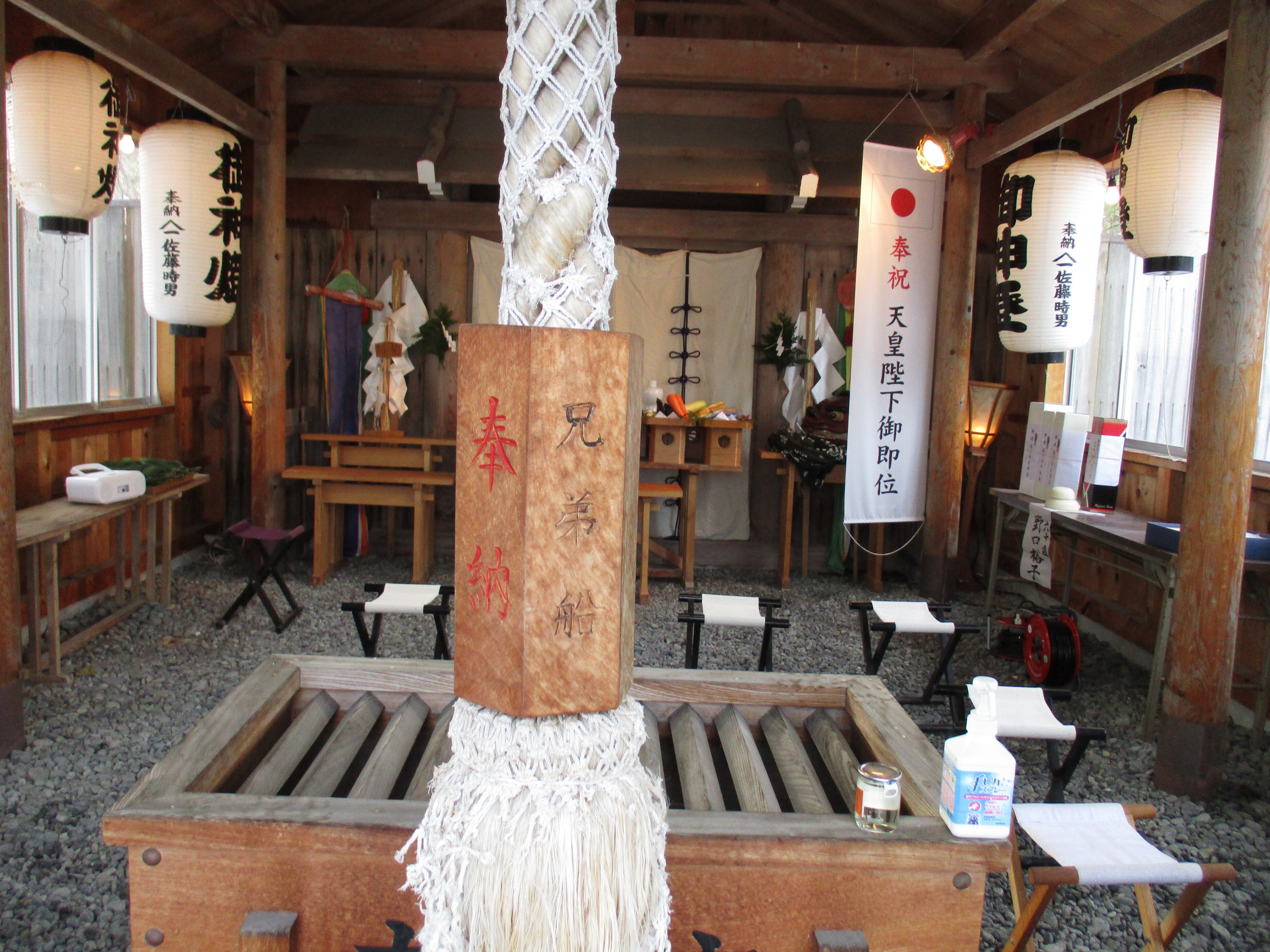 こんにちは、事代主神社の例大祭の風景です。参拝時には鳴らす鈴は、歌手の鳥羽一郎さんからの奉納の鈴です。平成8年と刻まれ、奉納、兄弟船、鳥羽一郎と文字が見えています。年数が経ち薄くなりましたので、濃く修正します。明上雅孝。