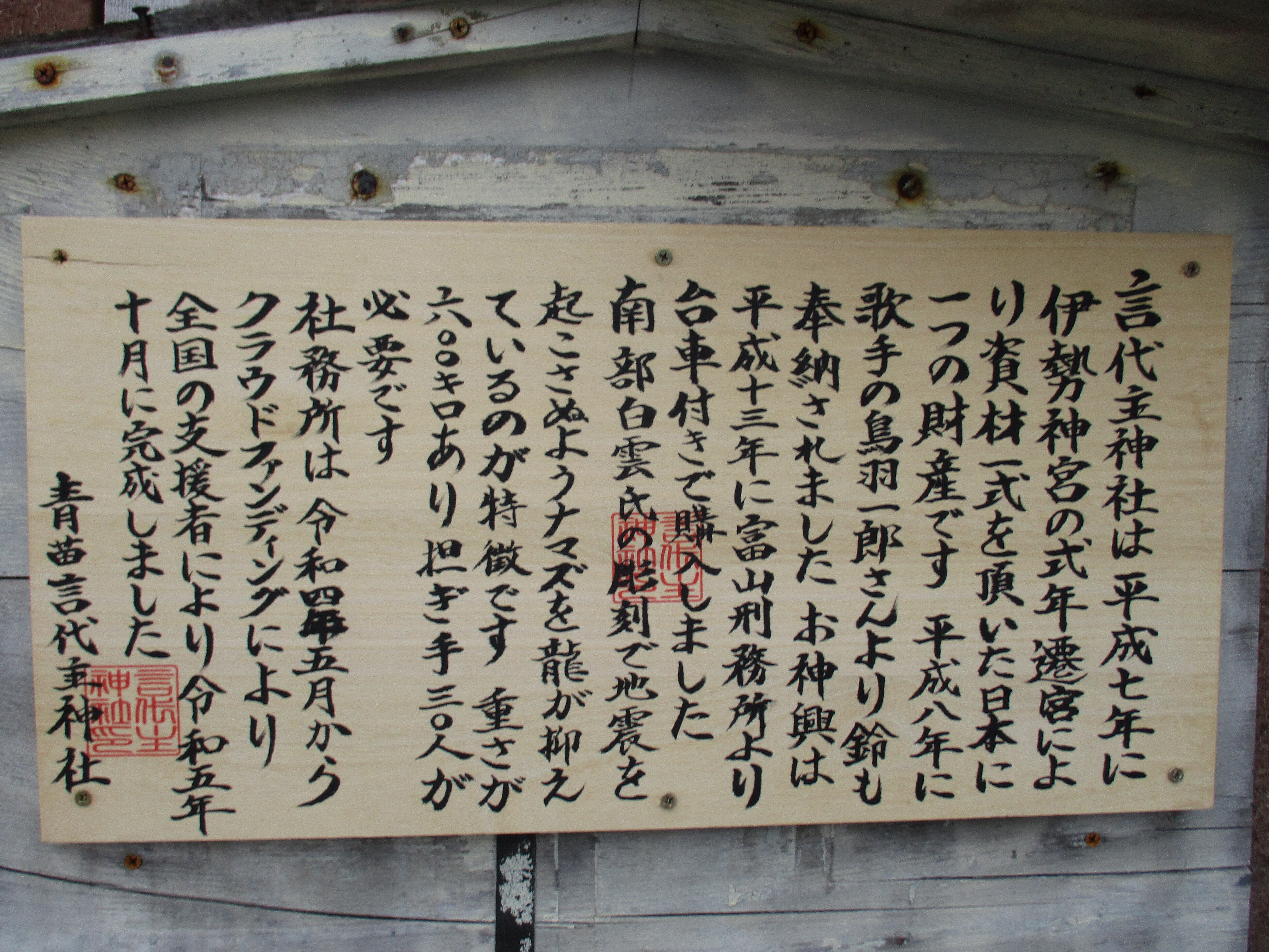 こんにちは、2年がかりで神社内の整備を終えました、青苗の月讀みさんですよ。備品の提灯も出来、受ける板も新しくなりました、地元の人の奉納です。2月20日の大漁祈願祭から、心を入れ替えて、活動報告もします!明上雅孝。