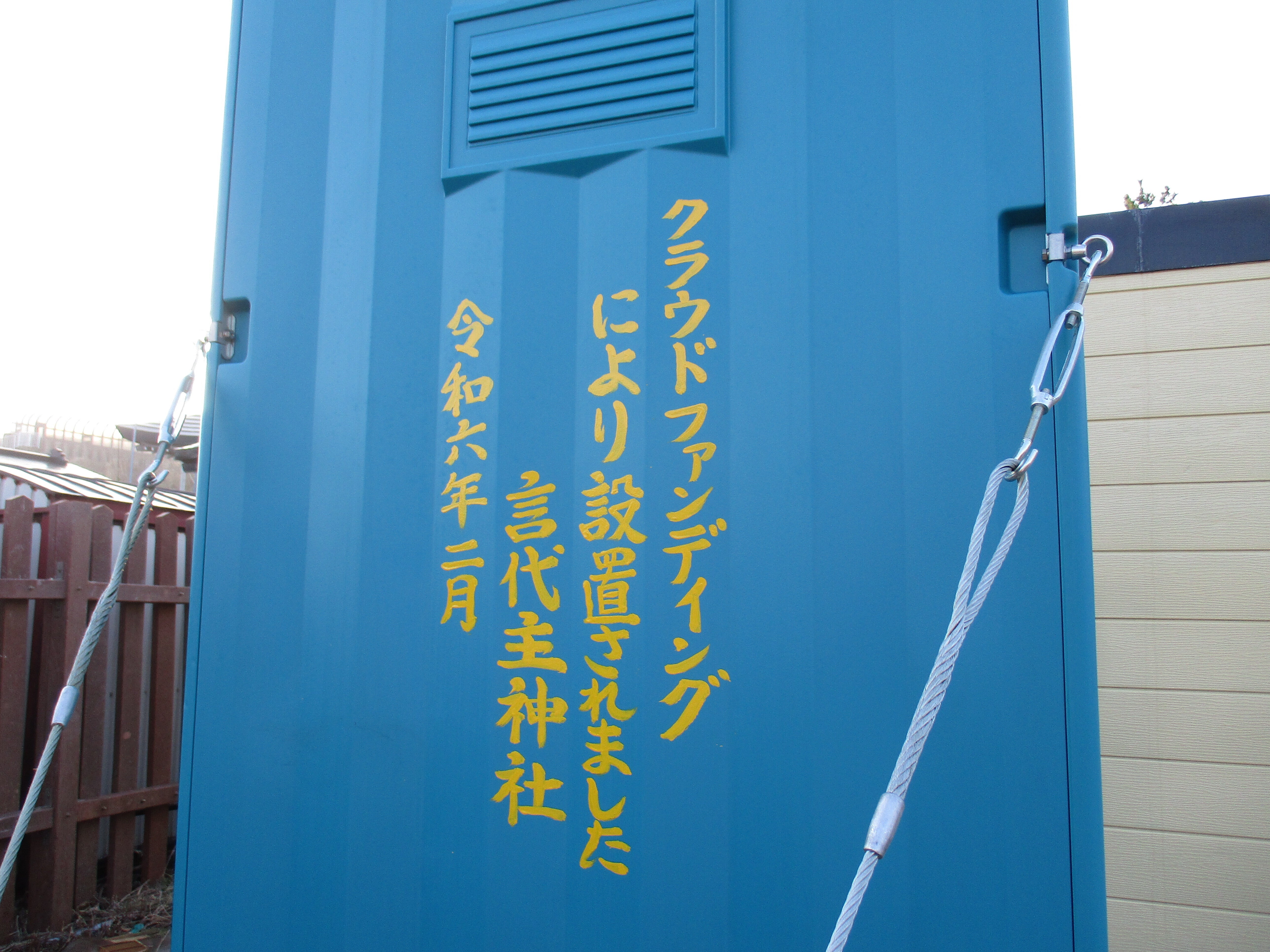 こんにちは、最後の完成のクラウドファンディングの、簡易水洗トイレです。プラスチック製品なので、直接にペンキで書きました。道路沿いから見えます。明上雅孝。
