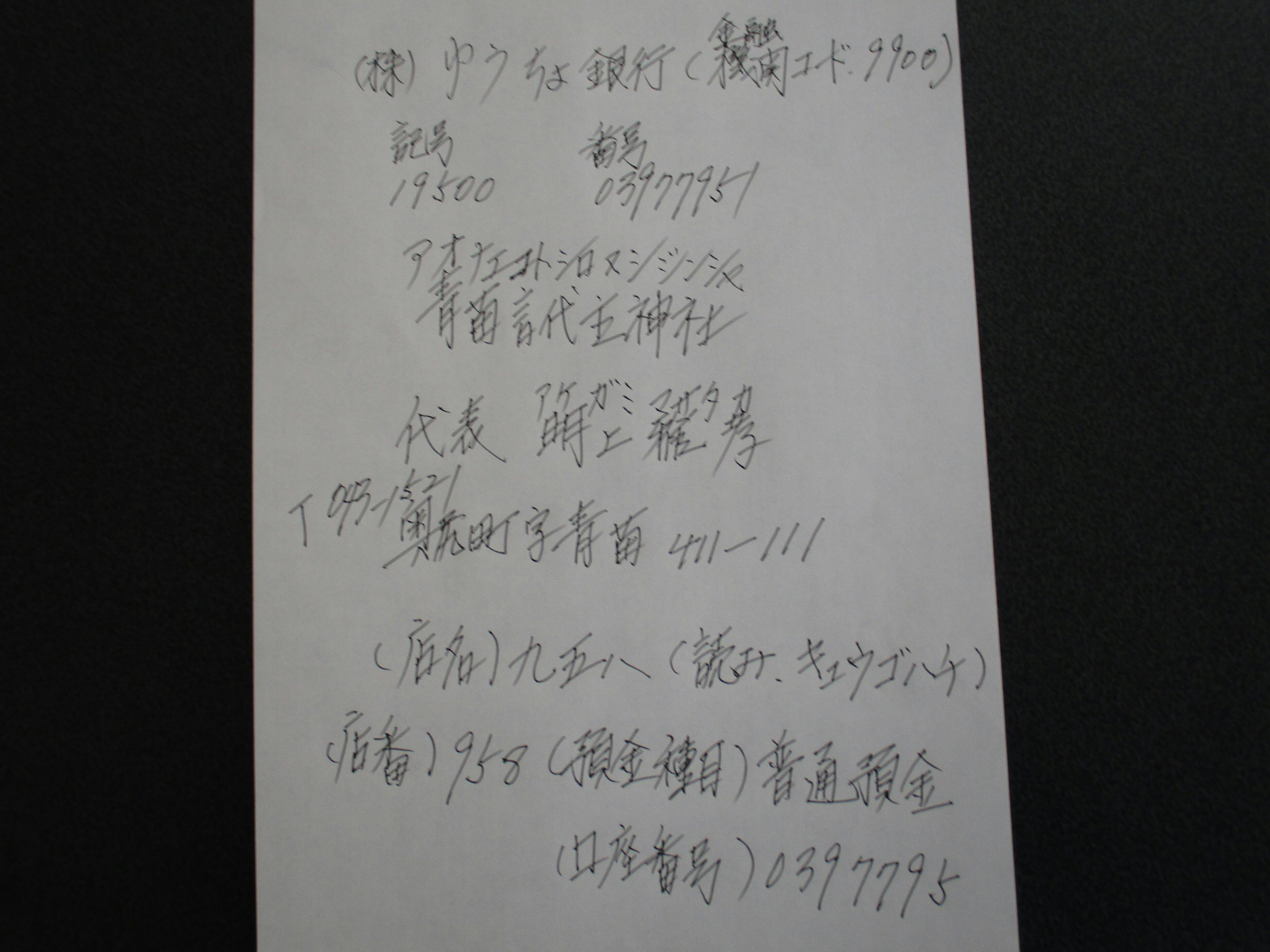 こんにちは、事代主神社の郵便局の通帳です。年1回の決算書の完成報告をしています。この度、金粉の和紙で手帳型の文字のみの御朱印を作成しました。島に来れない方の為に、3000円の口座振り込みにより、礼状、御朱印を郵送します。郵便番号、住所、お名前、電話番号を教えてください。島のワインやお酒の返礼品も金額により可能です。詳しくは、090-5984-1384、明上雅孝へ。事代主神社の御朱印ですよ。支援金の5万円では、アワビも返礼品にしています。運賃込みで支援金の40パーセントほどのお返しとなります。お許しください。離島なもので。島の経済が回ると嬉しいです。神社の維持費を募集しています。活動するために。明上雅孝。電話のショートメールは出来ます。