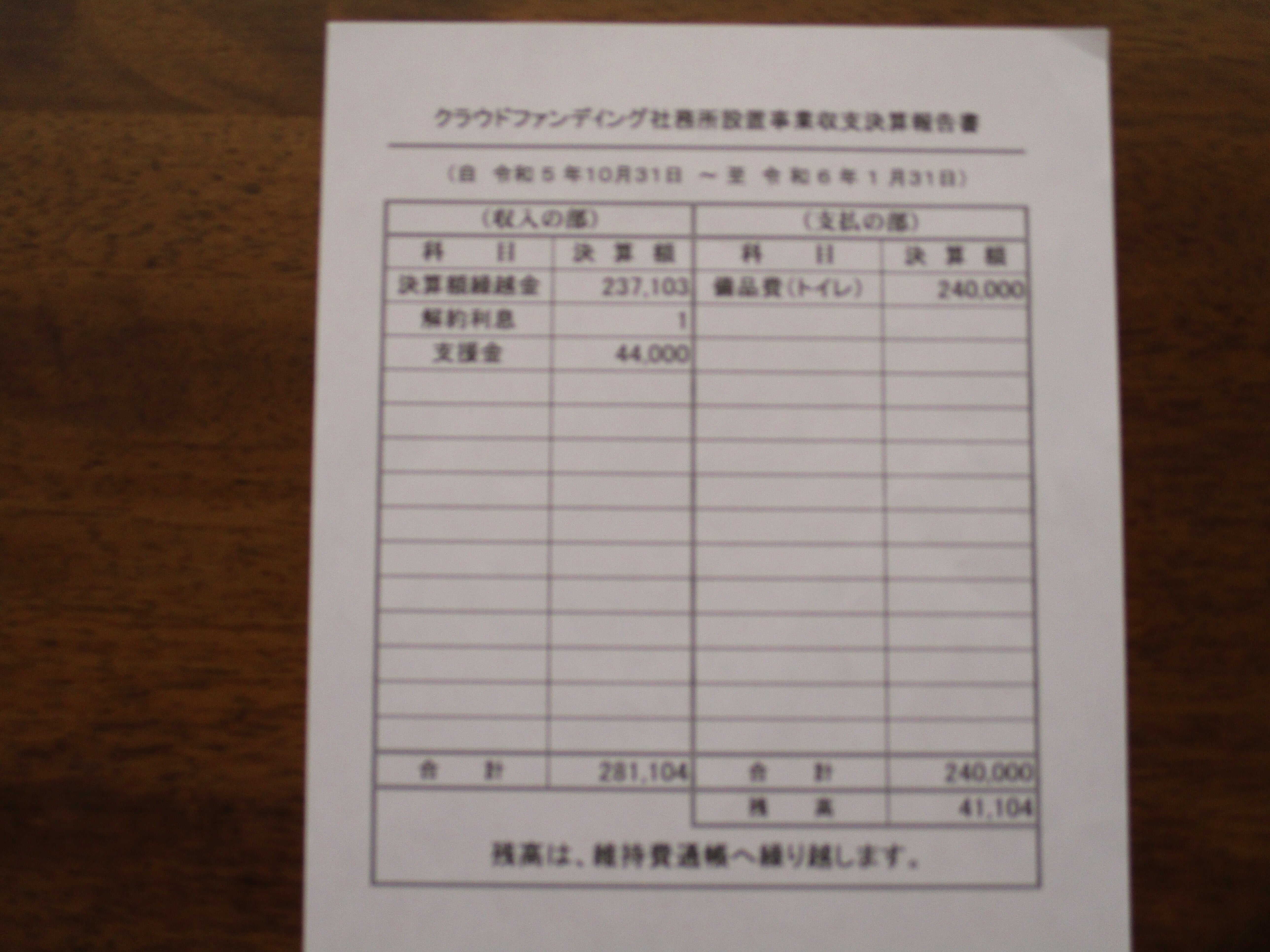 今晩は、クラウドファンディングの最後の決算報告書です。繰越金は維持費の通帳の郵便局の通帳に1本にしています。ありがとうございました。感謝です。なお、御朱印希望の方は私に電話を下さい。090-5984-1384、あけがみまさたか、明上雅孝へ。