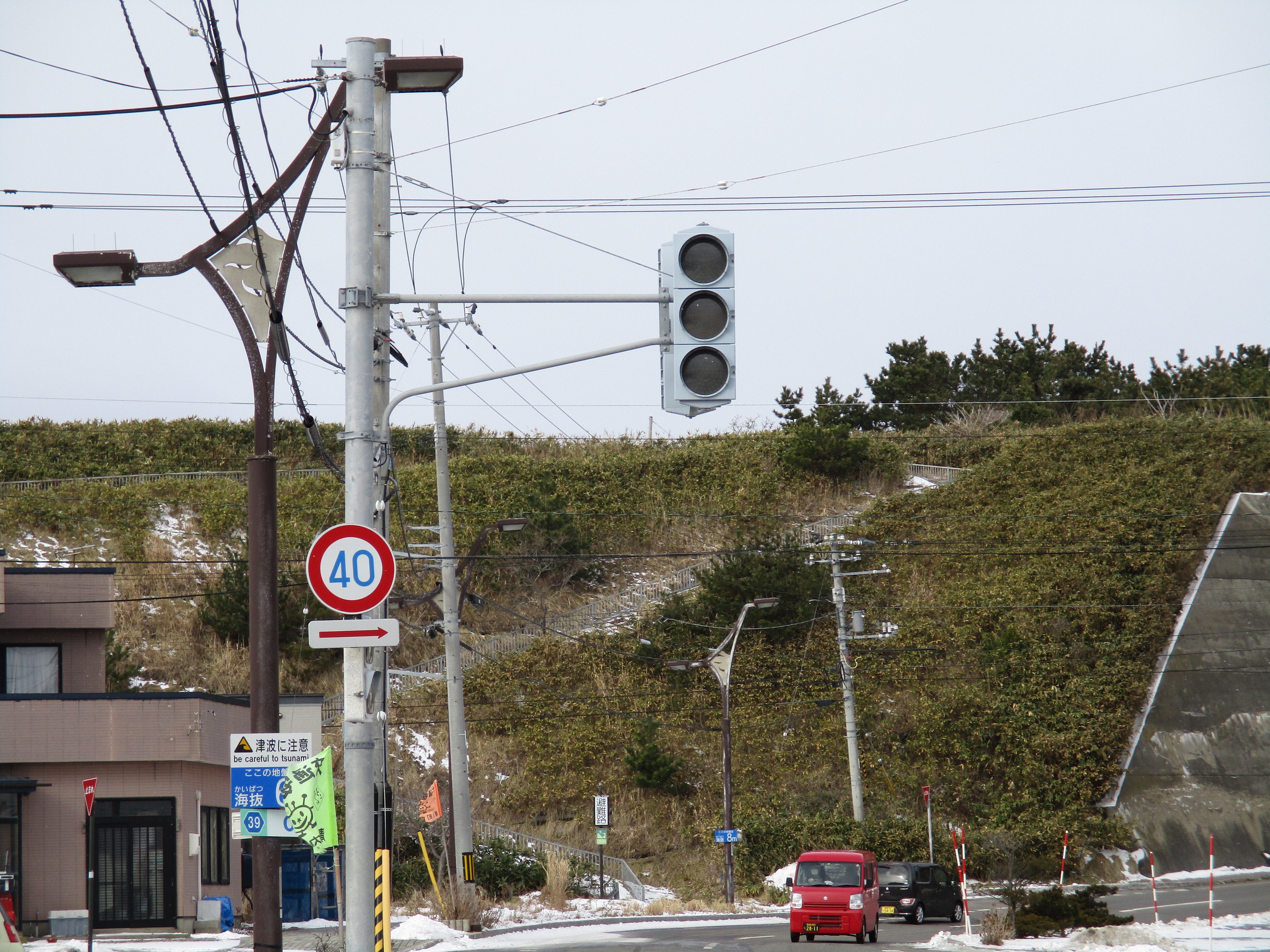 こんにちは、今も信号機が消えています、島は塩害がひどいので。今まで以上に島の人は気をつけています。雪が少ないので助かりますよ、いつもはアイスバーンになるので、怖いです。今、直す風景が見られます。明上雅孝。