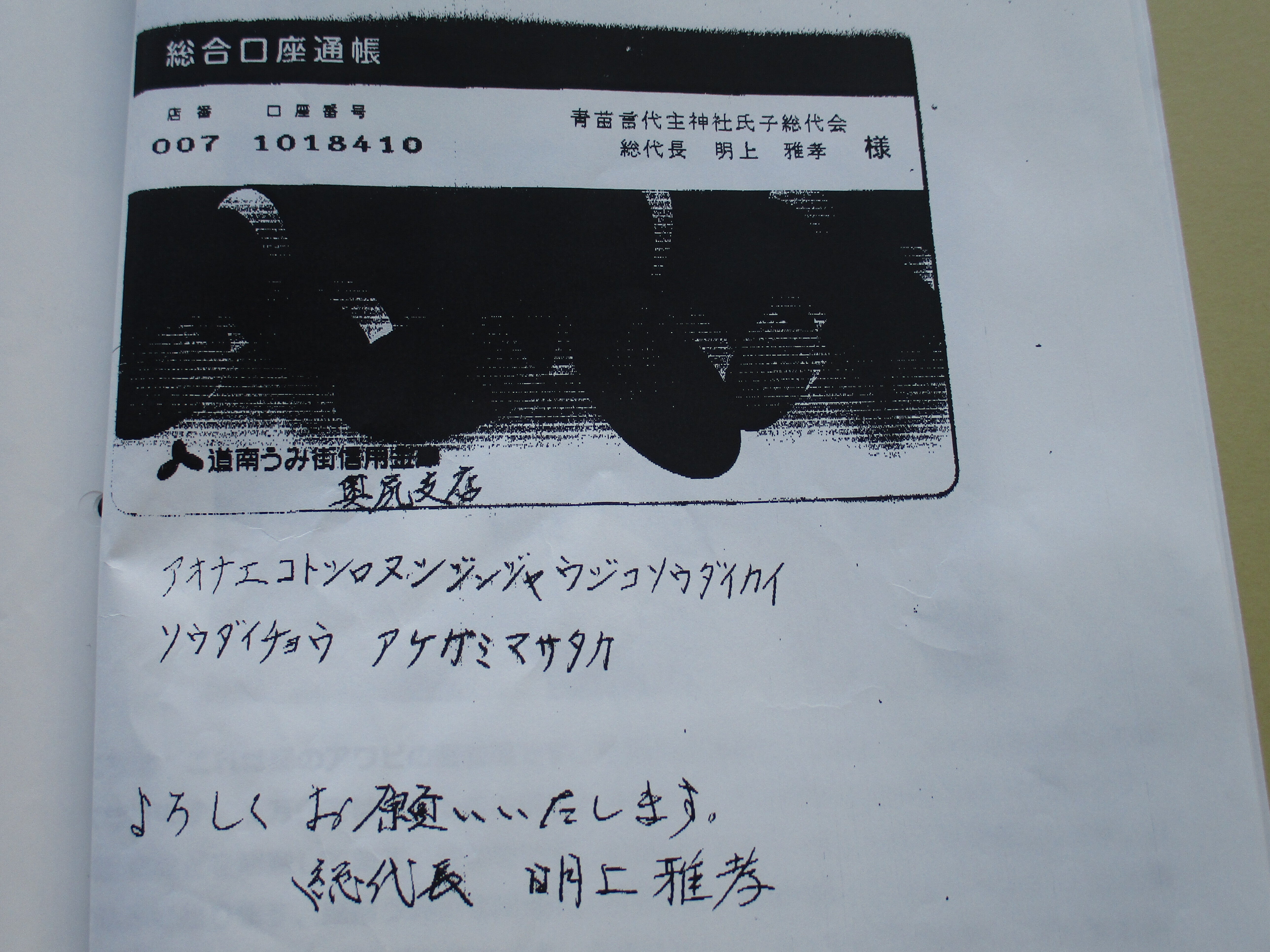 こんにちは、31日で通帳を解約します。31日までは希望される方へ返礼しています。完成の御朱印と手帳型御朱印を。1口3000円です、口座振り込みですが。由緒と共に郵送します。最後のお願いとなりますが、今の残高は38000円です。この後は維持費に使わせていただきます。最終の完成写真と収支決算書は出来次第、メールにて報告します。上記の口座振り込みになりますが。最後のお願いになりました。090-5984-1384、明上雅孝。