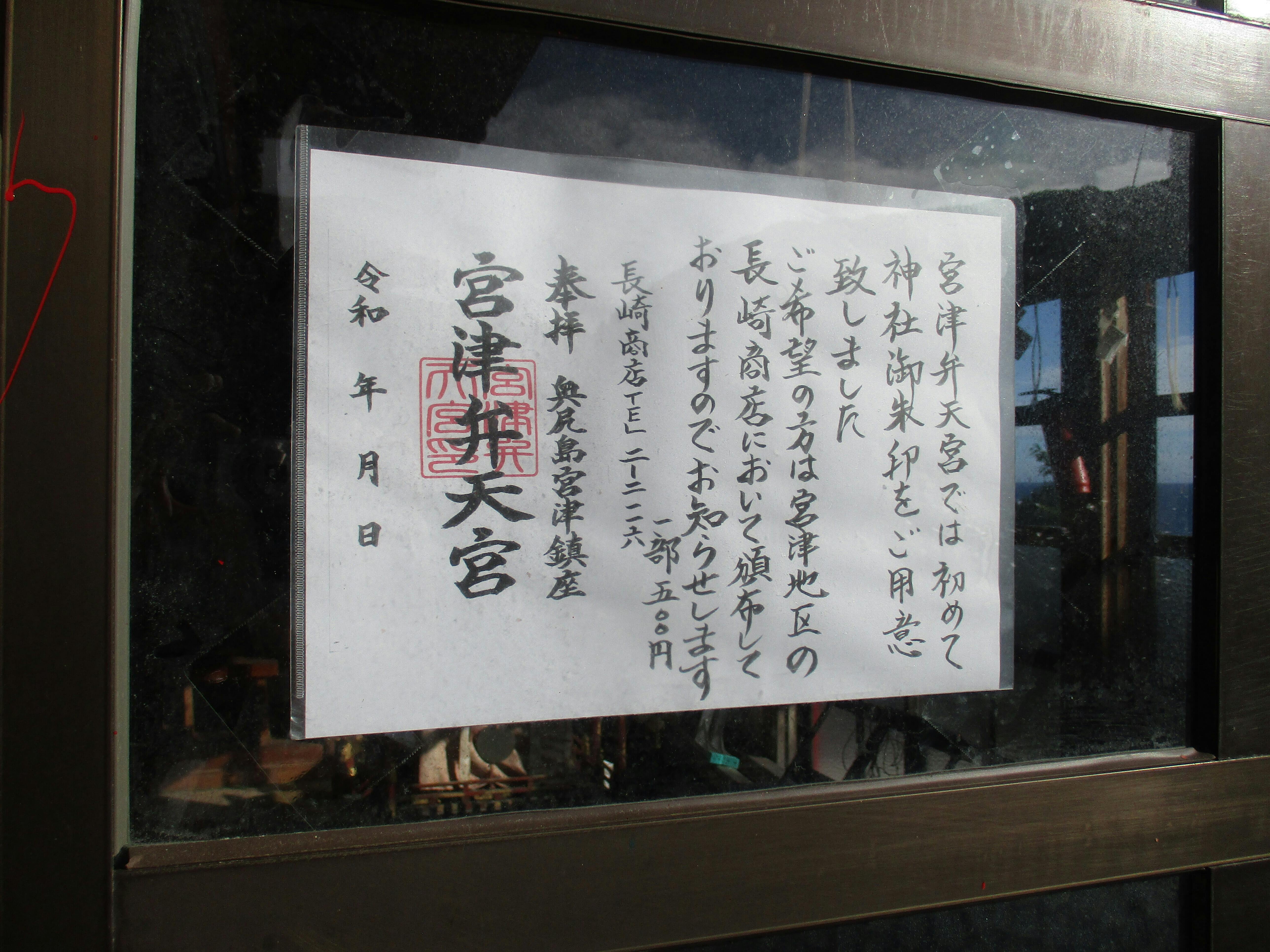 こんにちは、宮津弁天宮の御朱印も初めて作成しました、定期観光バスも案内してます。164段の階段を下がり上がりします。道路がついたので。今までは下から鳥居を通りました。半分の階段でした。参拝後の御朱印も人気です。金粉の和紙で手帳型です。来島記念には1枚500円で購入出来ます。宿が少なく。日帰りも多いです。8月は1日2便体制なのでフェリーは便利ですよ。明上雅孝。