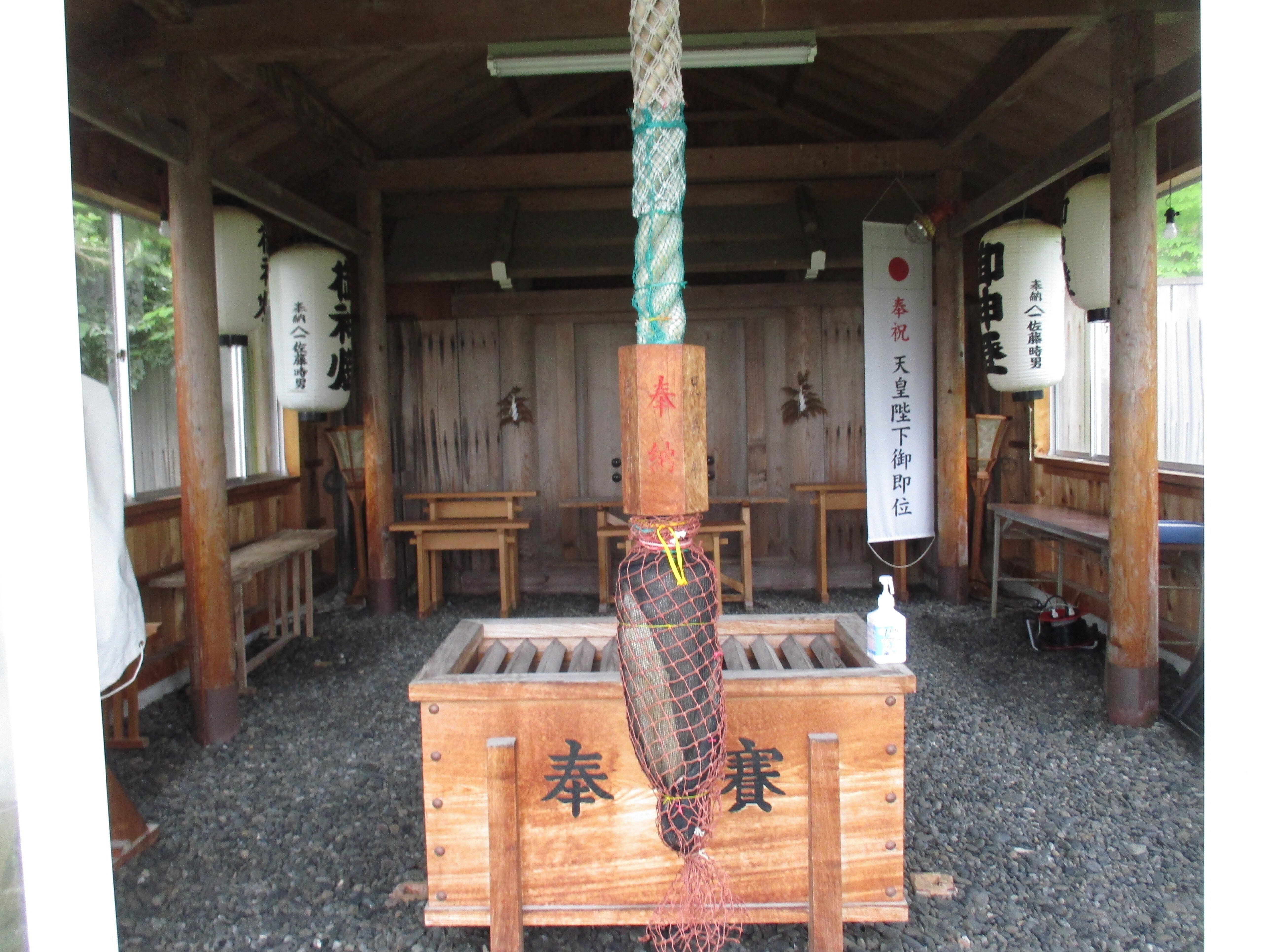 おはようございます!事代主神社の例大祭も終わりましたが、この場所は式典会場です。さい銭箱、歌手の鳥羽一郎さんからの奉納の鈴が見えています。奥には月讀み宮に入るための扉があります。扉を開けると階段が付いた建物があります。平成7年の伊勢神宮の式年遷宮で資材1式を、頂き事代主神社になりました。資材1式いただくのは青苗だけです。前の神社は平成5年の地震災害で焼失しました。お神輿も。今は全て復活しています。クラウドファンデングで2年もかかり神社内の整備も終えました。案内板に詳しく説明しています、歴史を刻みましたのでご覧ください。支援者に感謝です。090-5984-1384、明上雅孝。来島記念に御朱印も購入されています。1万円以上の支援金の40パーセントほどをお返しの希望者の質問も受けています。前には島のお酒やワインを返礼しました、御朱印は別便で郵送しました。残りは神社の維持費に使います。島からの運賃が高くワイン1本が同じくらいの運賃がかかる事もあります。090-5984-1384、明上雅孝。青苗の事代主神社のことです。宮津弁天宮ではありません。