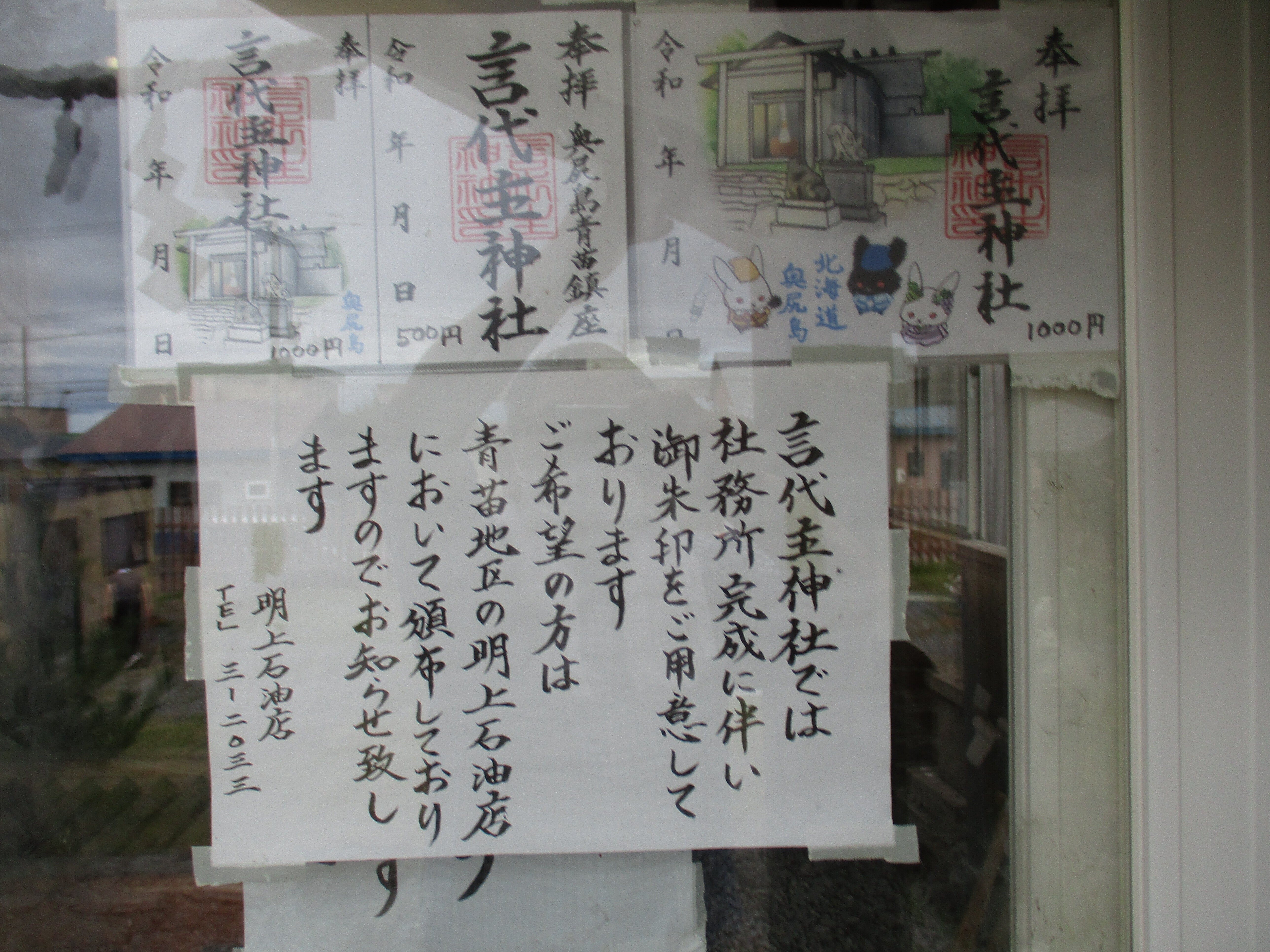 今晩は、青苗の事代主神社には、御朱印のお知らせをしています。3枚だけは。希望の方は、お店でお待ちしています。参拝も道路から30メートルなので直ぐ可能です。宮津弁天宮は道路から164段の階段を下がり上がりしますので、休みながらおあがりください。宮津弁天宮は、赤色ではでやかですが、事代主神社は木の色です、落ちついています。明上雅孝。