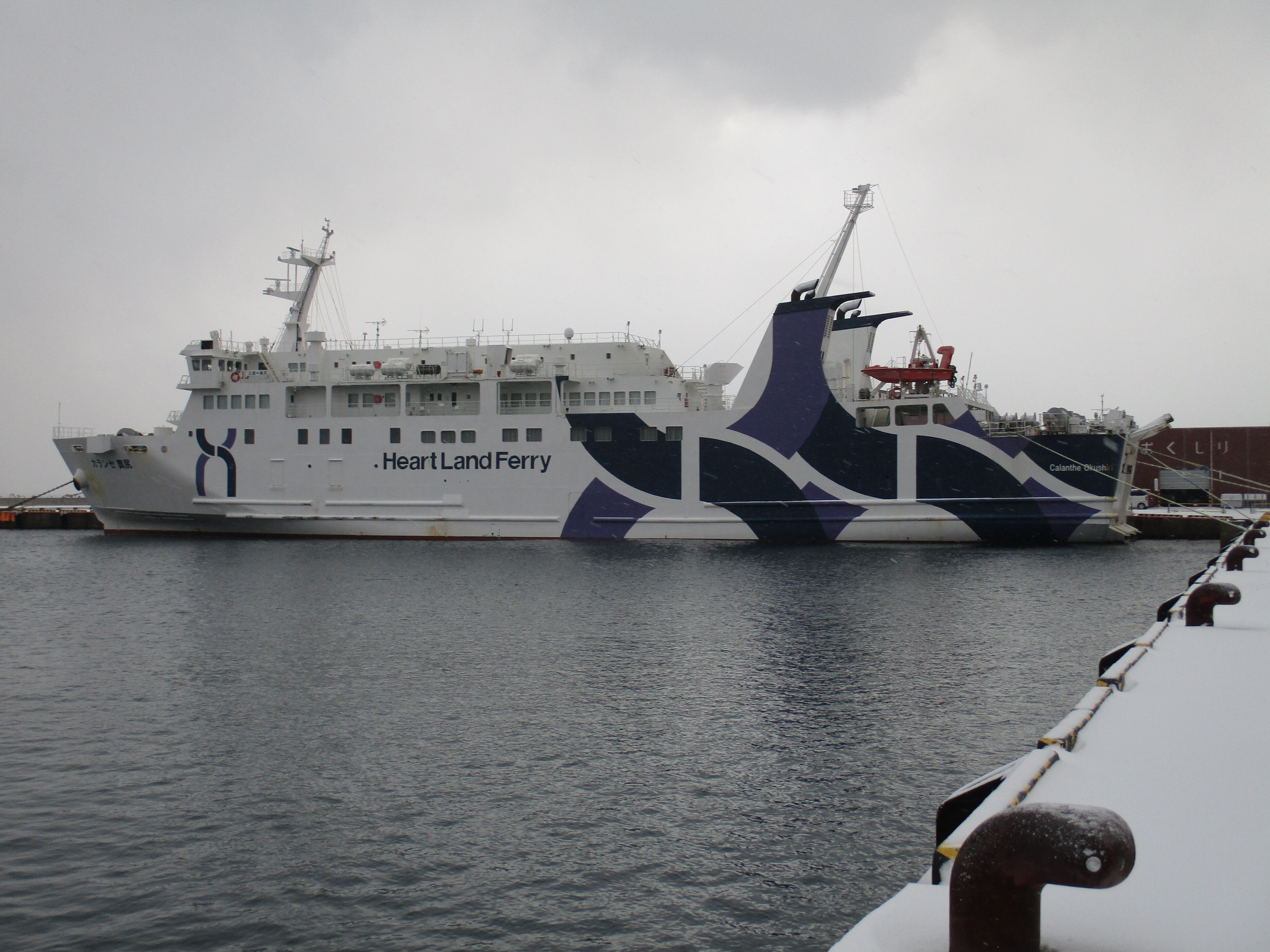こんにちは、冬のフェリーとターミナルと駐車場です、江差港も奥尻港も駐車場は無料です。江差港には島の住民の車が多く止めてあります。フェリーの車の運賃が高いので。明上雅孝。