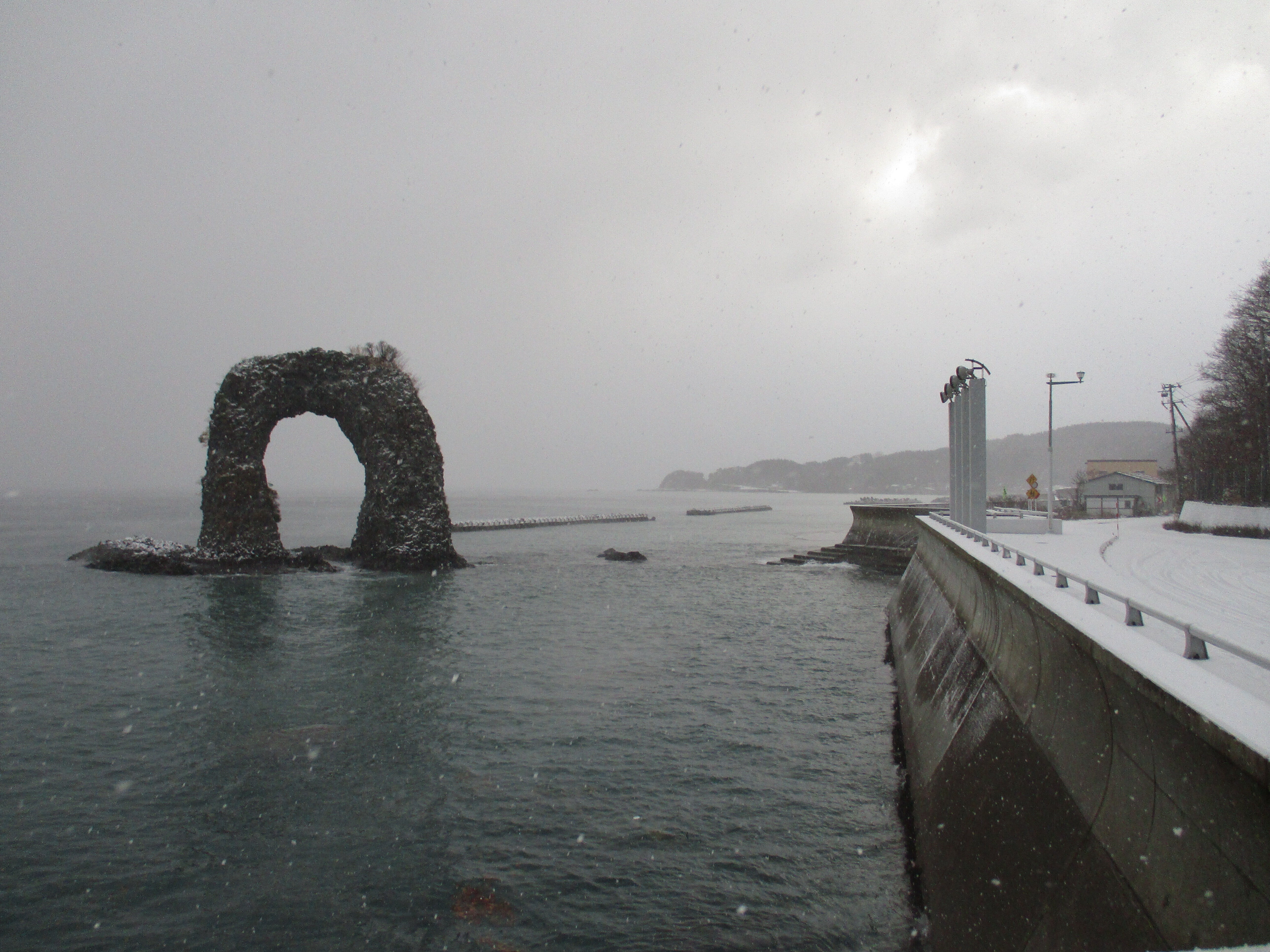今晩は、昨日のなべつる岩です。島のシンボルです。観光客が写真を撮ってる姿が見られます。昨日は観光会社の方が、島を訪れ勉強されていました。案内もついてました。明上雅孝。雪の光景です。いわれは鍋を持つ手の用です。