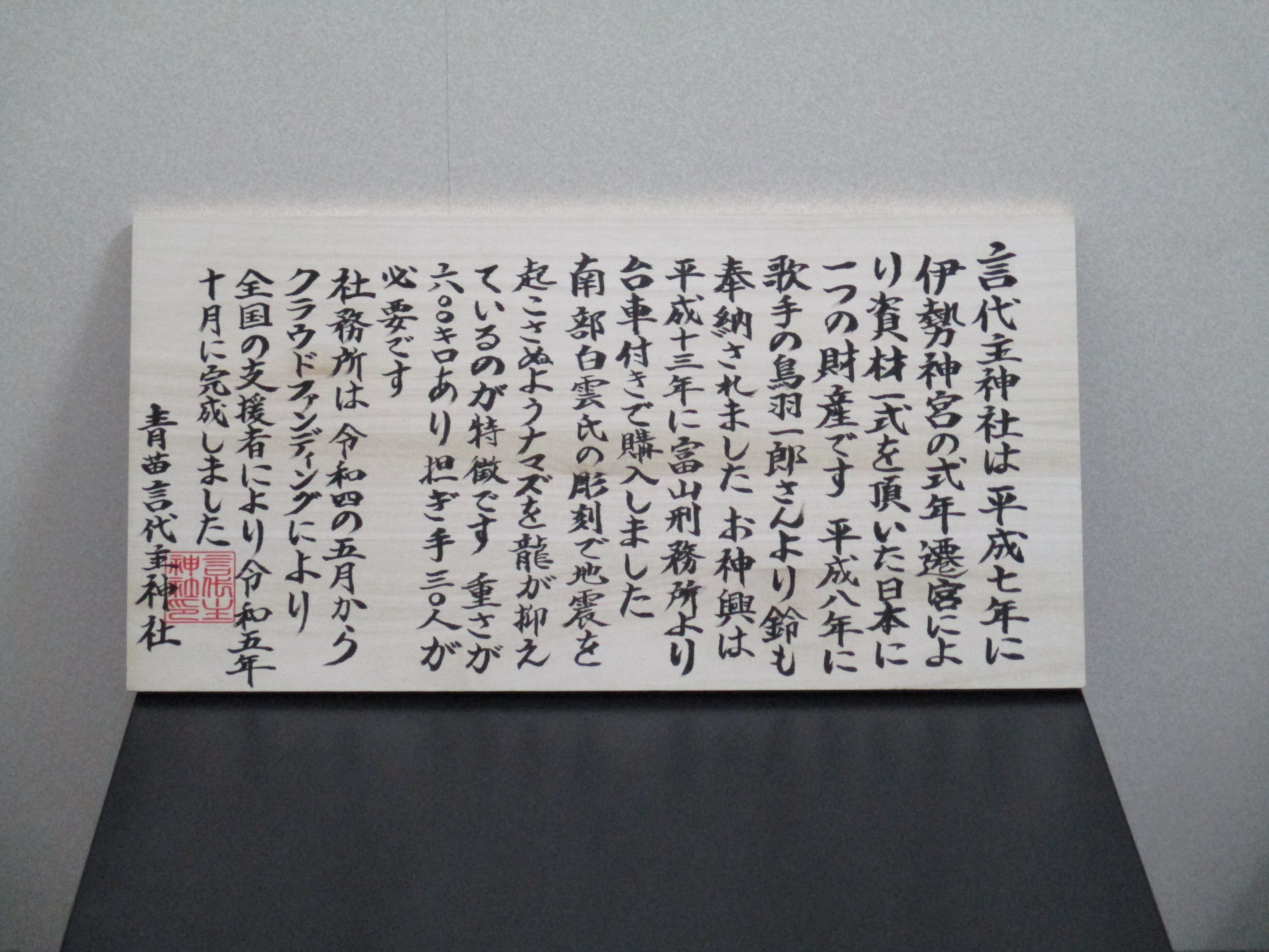 こんにちは、神社の入り口に掲示します。日本に一つの財産である事を参拝者に知ってもらいたいので。伊勢神宮の式年遷宮で島に頂きました、月讀み宮。地震を起こさないように、彫刻入りのお神輿。歌手の鳥羽一郎さんからの奉納の鈴。クラウドファンディングの社務所。御朱印も完成出来ました。明上雅孝。参拝をお待ちします。