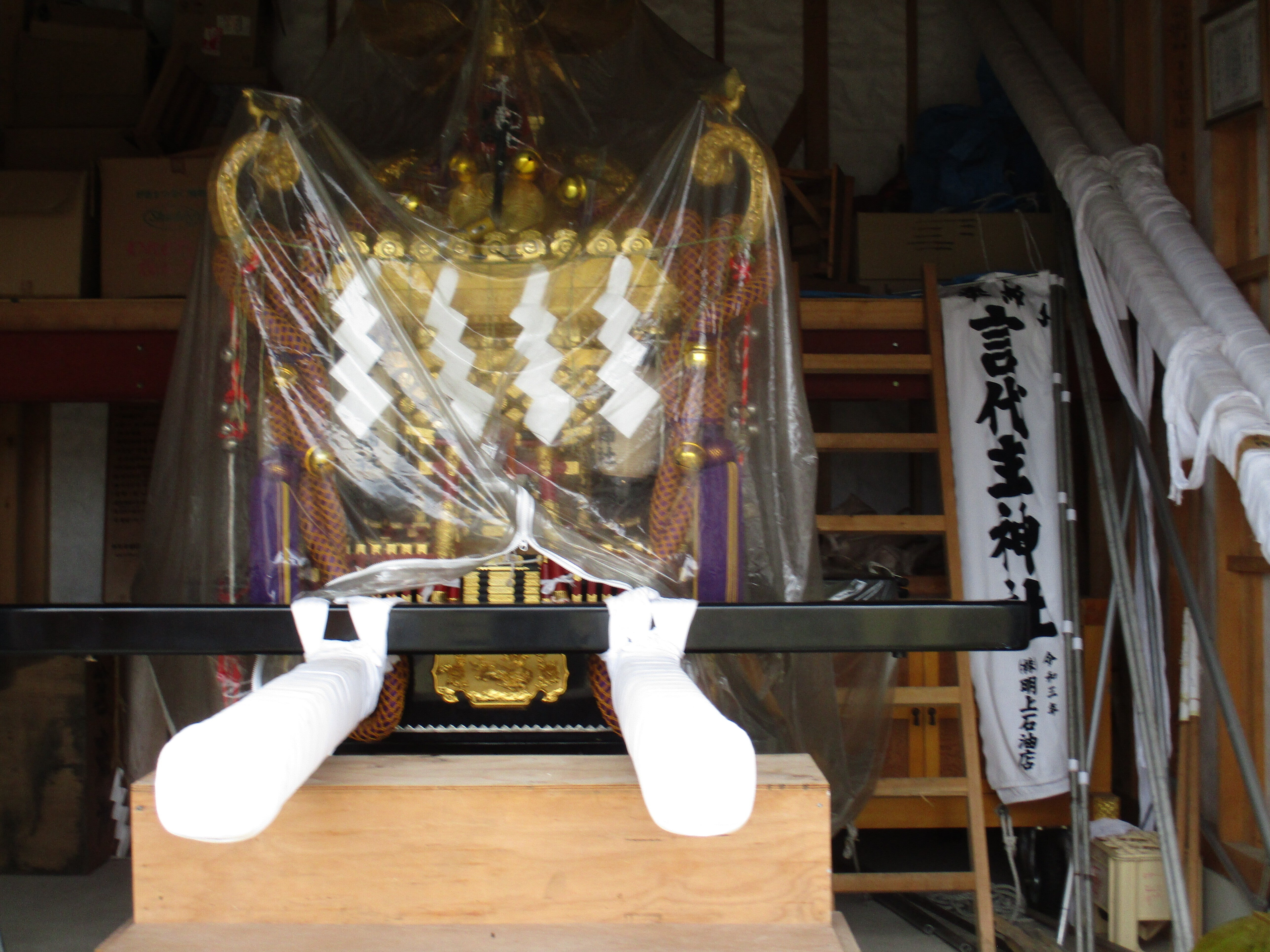 こんにちは、平成13年に製造元の富山刑務所より購入しました、お神輿ですよ。重さが600Kで担ぎ手30人が必要です。地震災害を起こさぬようにと、龍が抑えていますよナマズを。台車付きで850万円でした。人口不足になりましたので台車を使います。明上雅孝。島は晴れ12度。