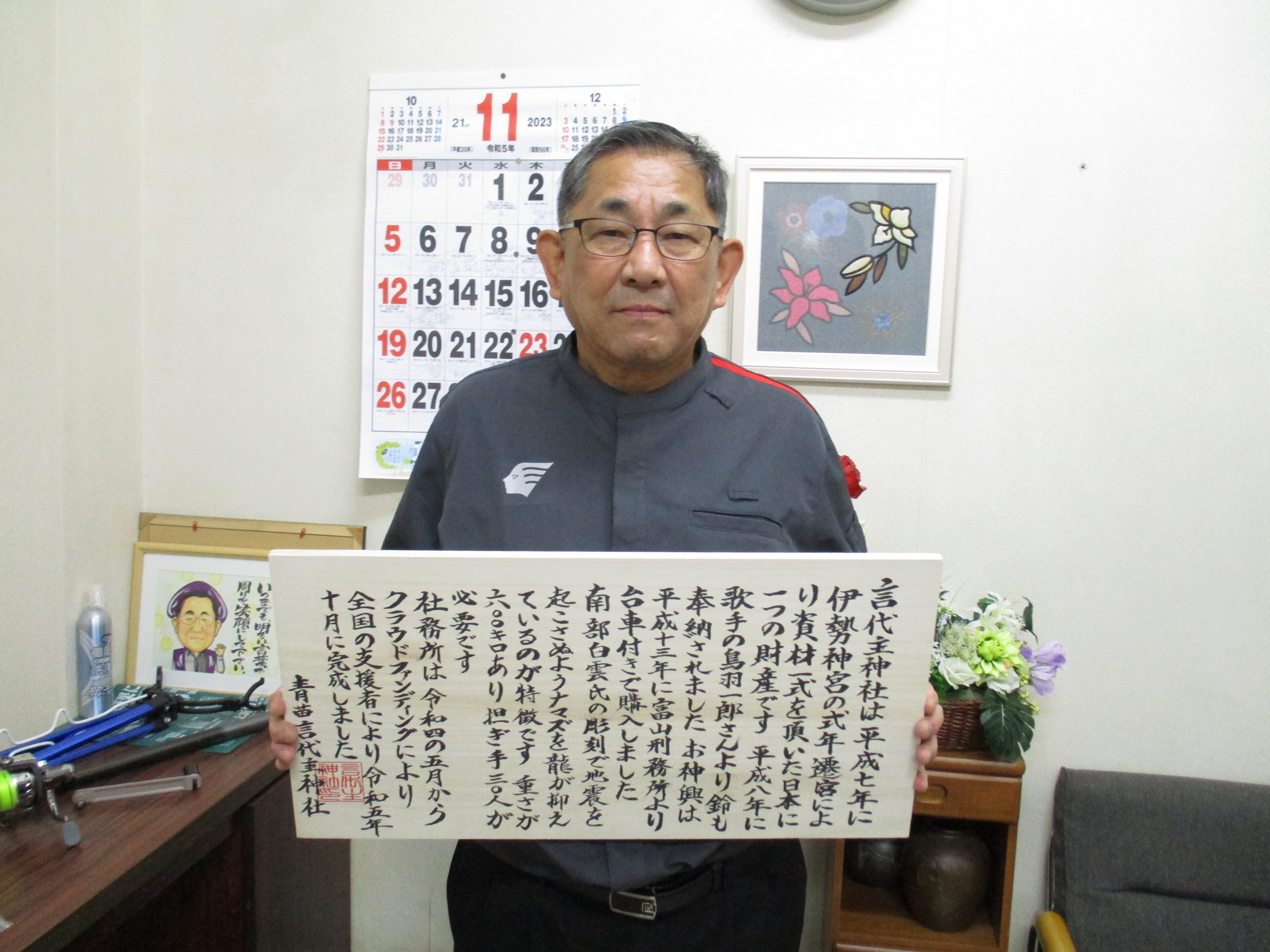 こんにちは、この場所に貼る、神社内の説明の印をします。案内板として掲示します、神社、歌手の鳥羽一郎さんからの奉納の鈴。南部白雲氏の彫刻入りのお神輿。クラウドファンディングの社務所。の歴史を刻みます。日本に一つの財産である事を、後世に残せれば嬉しいです。御朱印は特に。明上雅孝。板をはりましたらメールをします。段々と神社の整備が終わにちかずきますよ。提灯は来ましたし。古いのと交換します。社務所の完成の御朱印を希望の方は是非連絡くださいね。返礼品にしています。残りも少なくなりました。