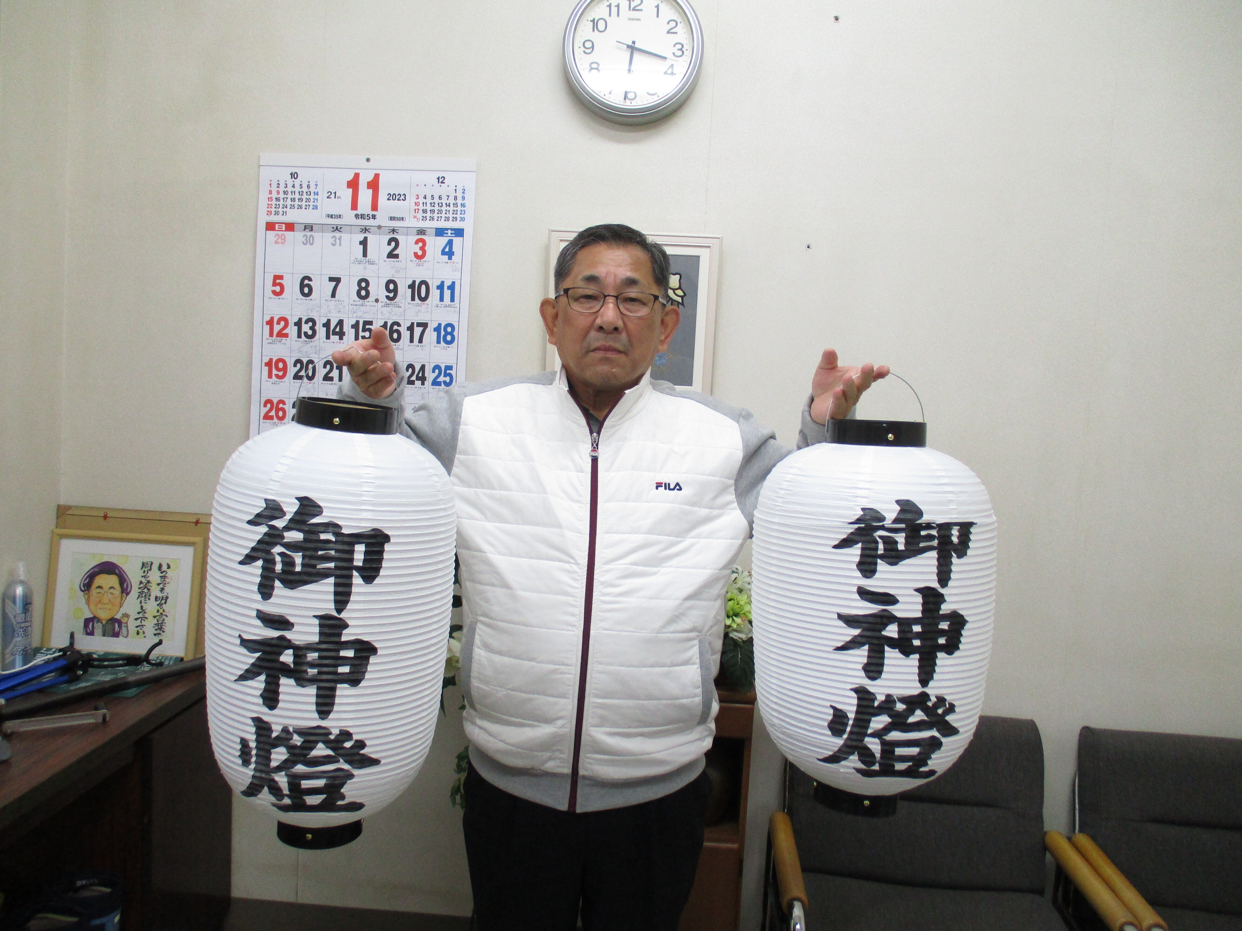 こんにちは、嬉しいです、この姿を見てください。最後の提灯です、備品が全部揃いました。後は案内板などに、神社は伊勢神宮の式年遷宮で島に頂きました、お神輿には南部白雲氏の彫刻入り、鈴は歌手の鳥羽一郎さんからの奉納ですよ、クラウドファンディングの社務所の建設、全てが記載されて目に留まりますよ。明上雅孝。
