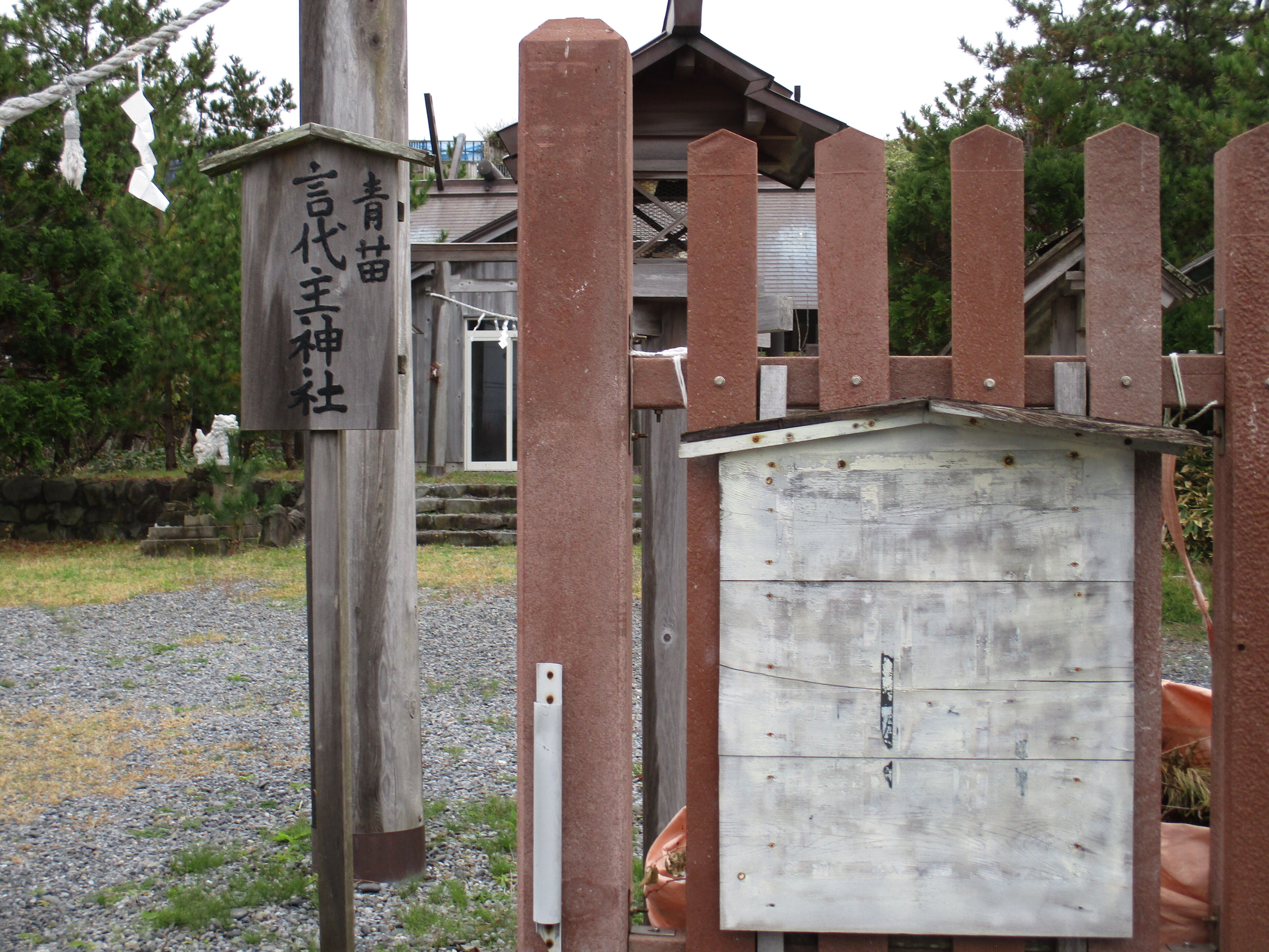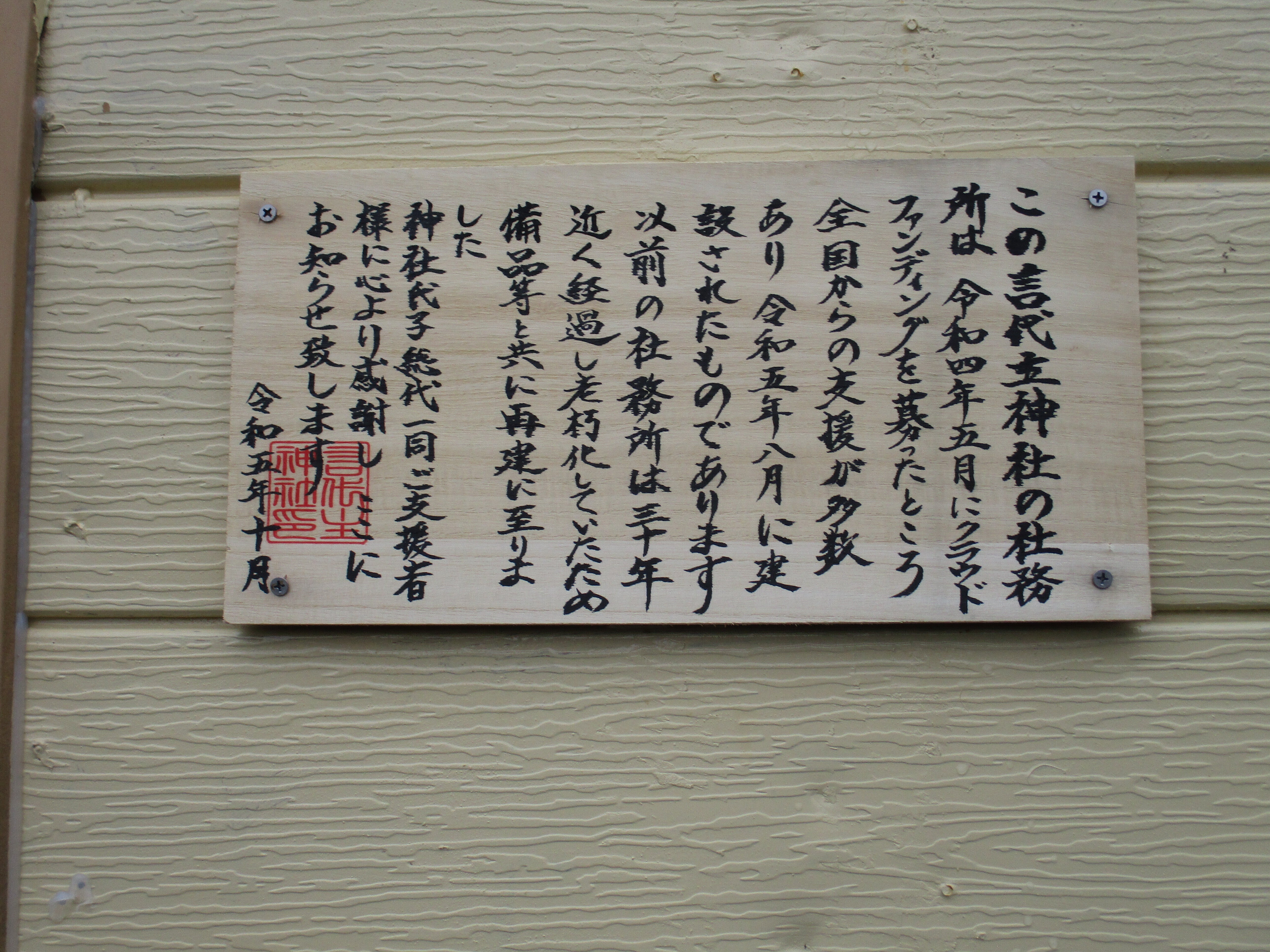 こんにちは、事代主神社の文字は入れました。見えてる案内板にきちんと整備の後に、歴史を刻みます。神社が伊勢神宮の式年遷宮で島に頂きましたこと、お神輿が地震災害を起こさぬようにと彫刻がある事、クラウドファンディングでの社務所の完成などを、書家により書き、クリアーのスプレーで仕上げます。明上雅孝。