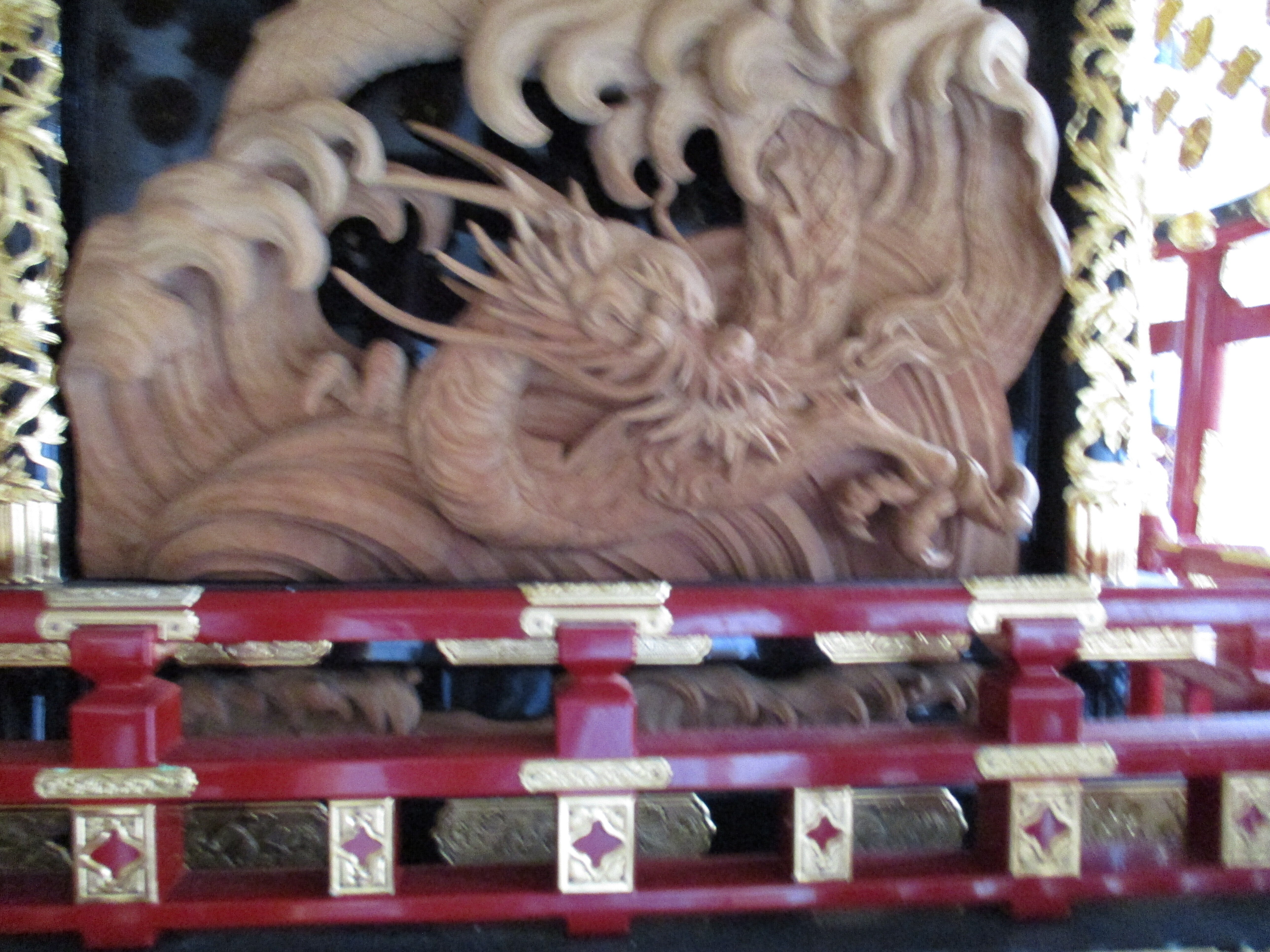 こんにちは、お神輿の反対の方に龍がえがかれてますが、富山の彫刻家、南部白雲氏の作です。片方には地震を起こさぬようにとナマズを龍が抑えています。神輿は850万で、台車付きで、富山刑務所より購入しました。製造元ですよ。600Kあり、30人で担ぎますよ。明上雅孝。