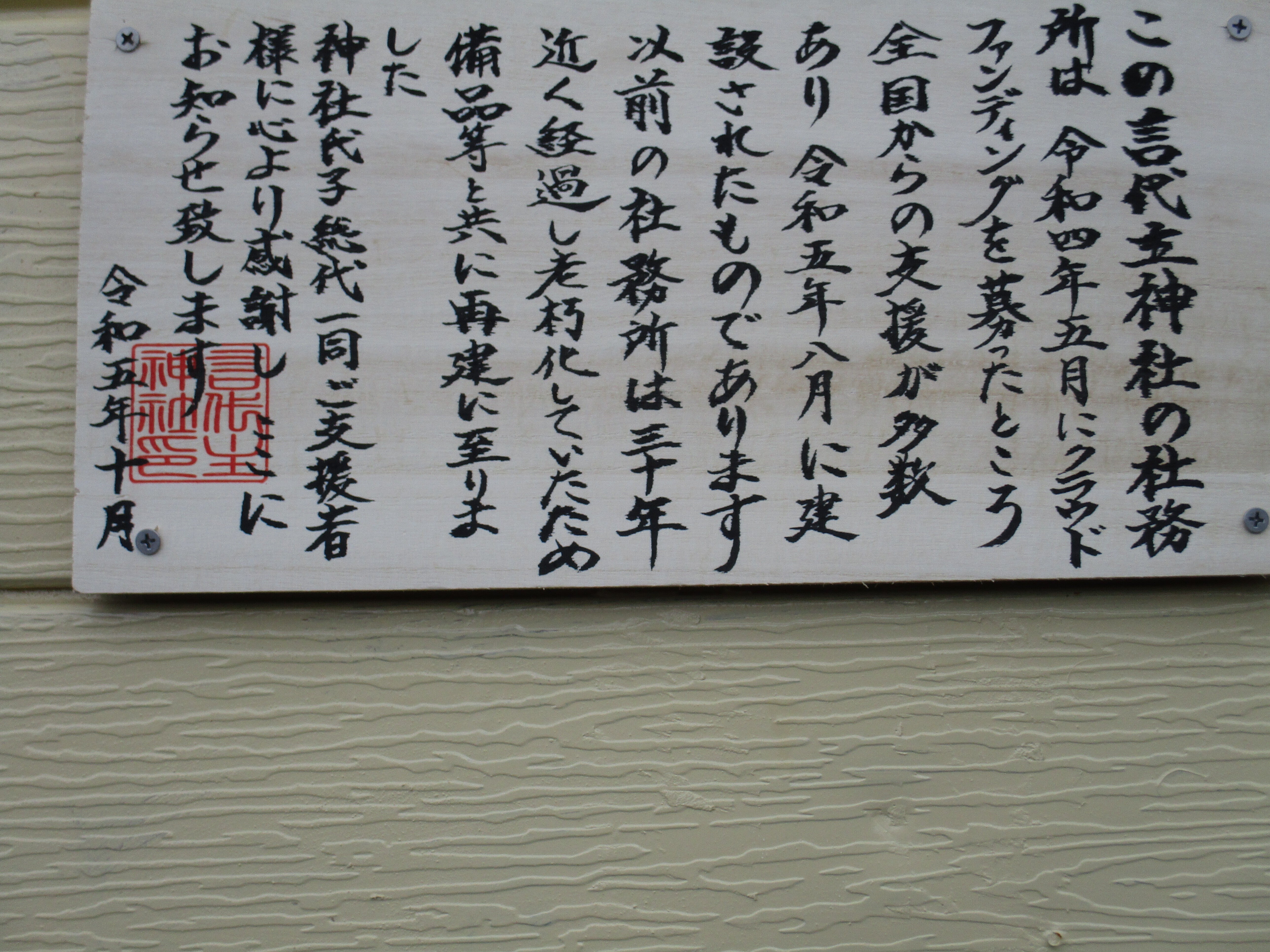 今晩は、社務所の表面に書きました、クラウドファンディングも終わり歴史を刻みました。令和4年の5月12日から7月30日までのクラウドファンディング、更に今も活動報告をしてます。3400回も超えてます。島はこれから厳しい冬に向かいます。前を向いて息が出来ない程風が強いです。無口になりますよ。明上雅孝。