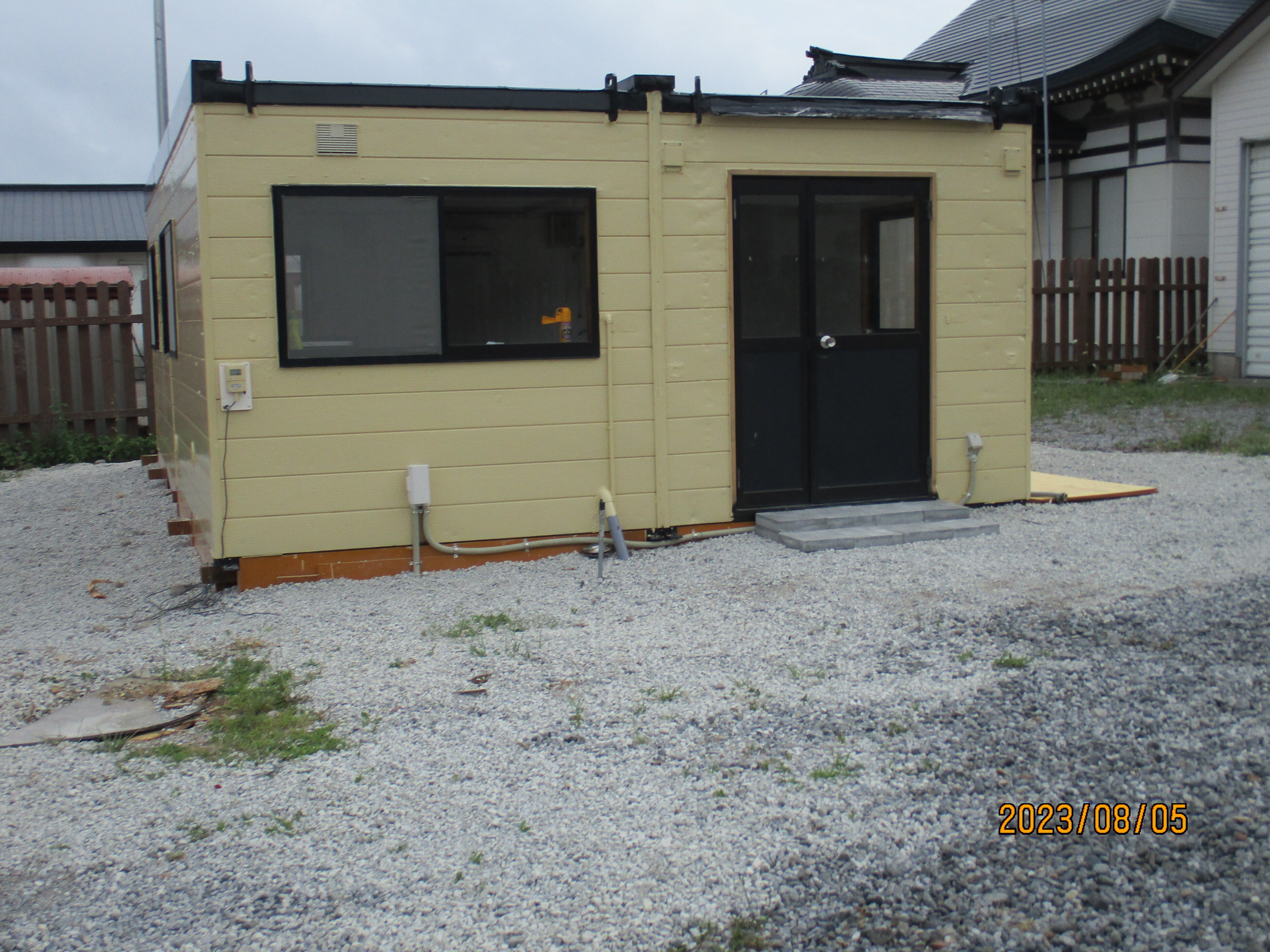 こんにちは、12坪のコンパクトなプレハブも支援金を使い地元から購入しました。明上雅孝。