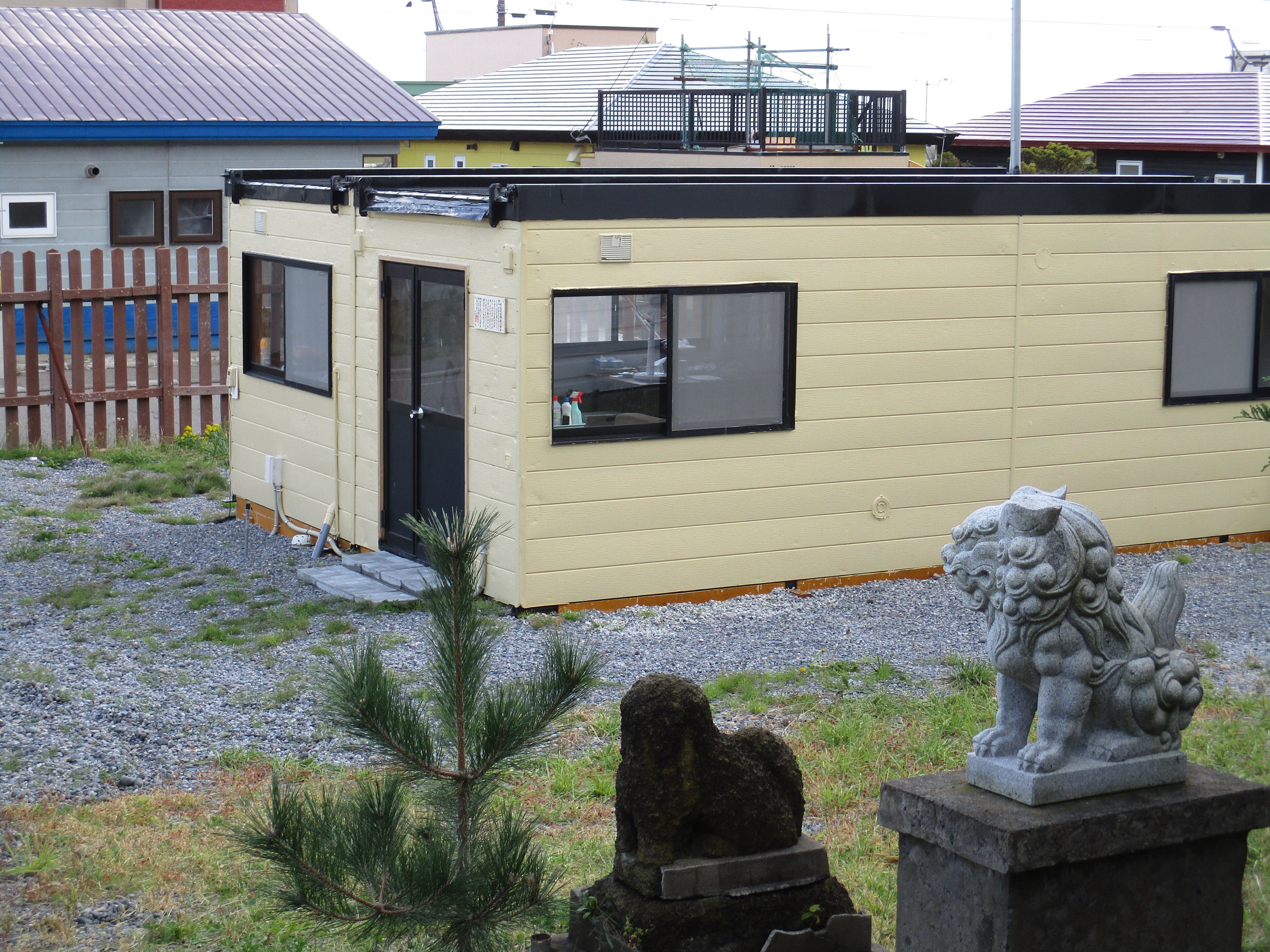 こんにちは、12坪のコンパクトな社務所になりました。屋根や外壁は有志が塗装しました。ペンキなどを購入しました。支援金の使用です、明上雅孝。
