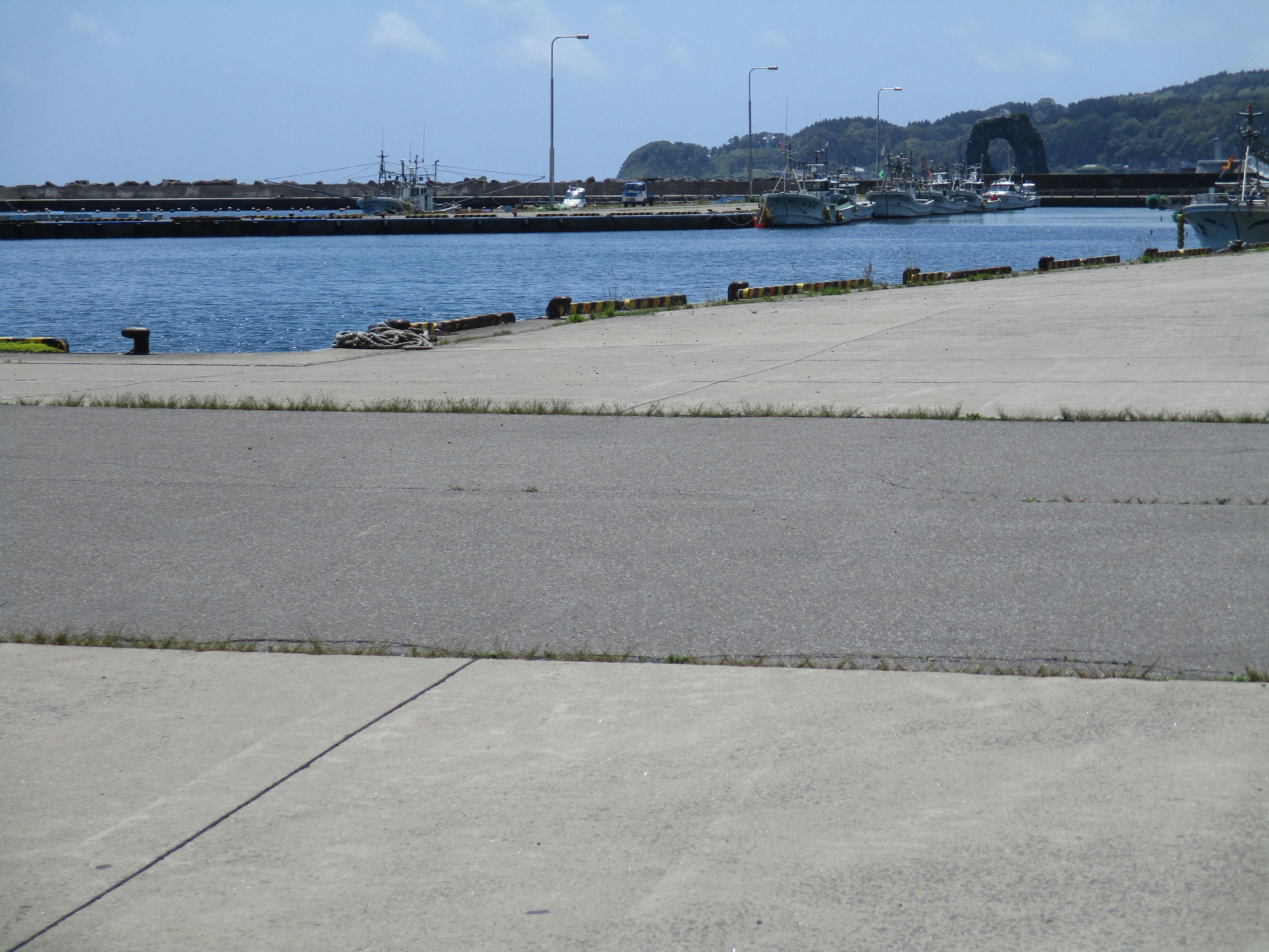 こんにちは、後ろに見えてるのは島のシンボルのなべつる岩です。ここは奥尻港です。イカ釣り船も見えていますが、今年はイカ漁は芳しく有りません。今はウニ漁が盛んです。一キロ3万と言うから昨年の2倍ですよ。明上雅孝。