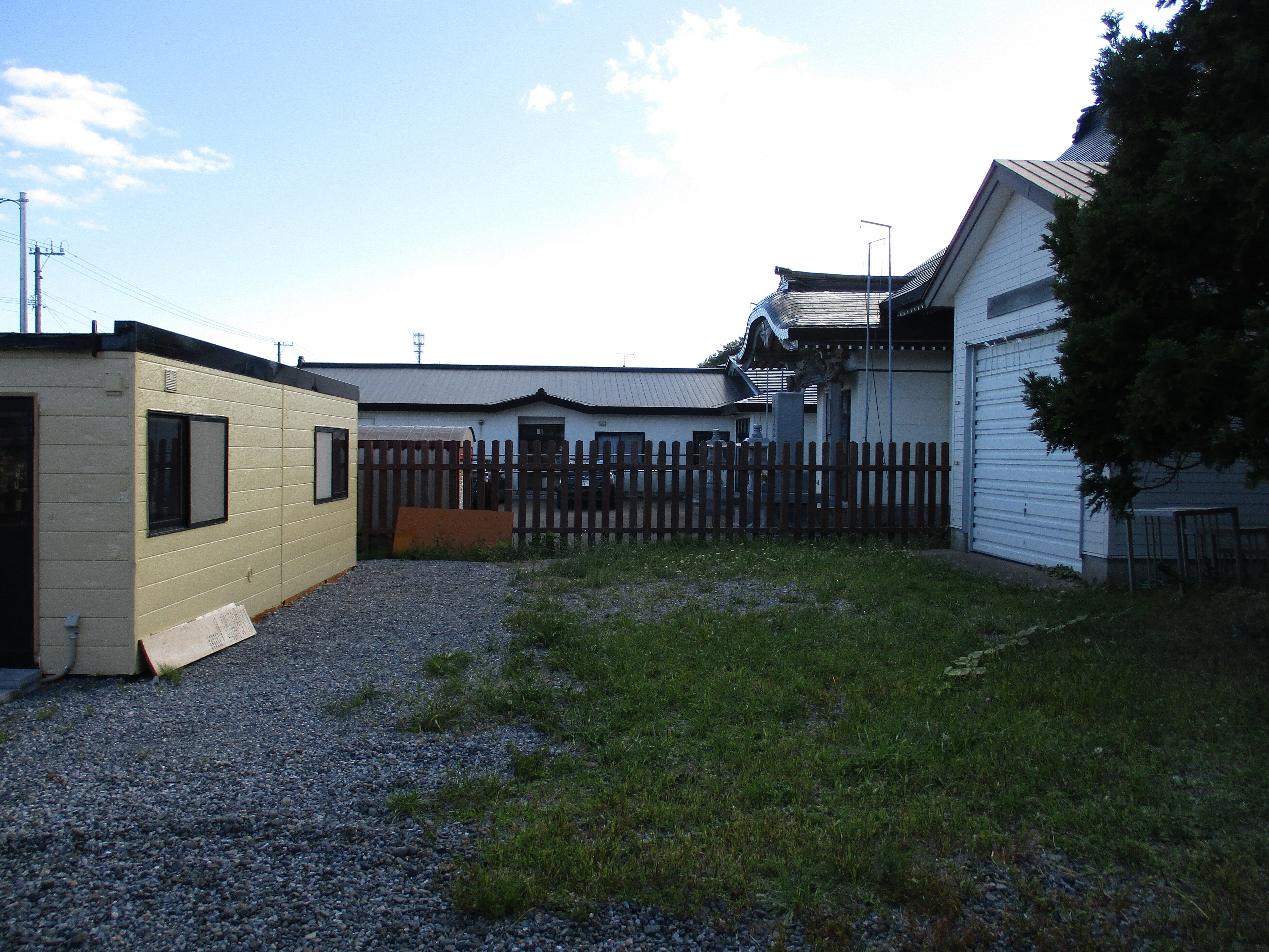 こんにちは、塀の奥がお寺です、青苗には3つのお寺があります。お寺の隣が青苗の事代主神社です。見えています左側が、今回のクラウドファンディングの社務所です。右端はお神輿の入れ物になりますよ。青苗は特に塩害がひどいです。地震災害から30年が経ちました。家の屋根も、錆びた家が目立ちます。島の外の工務店が来ています。地元の工務店は有りません。明上雅孝.