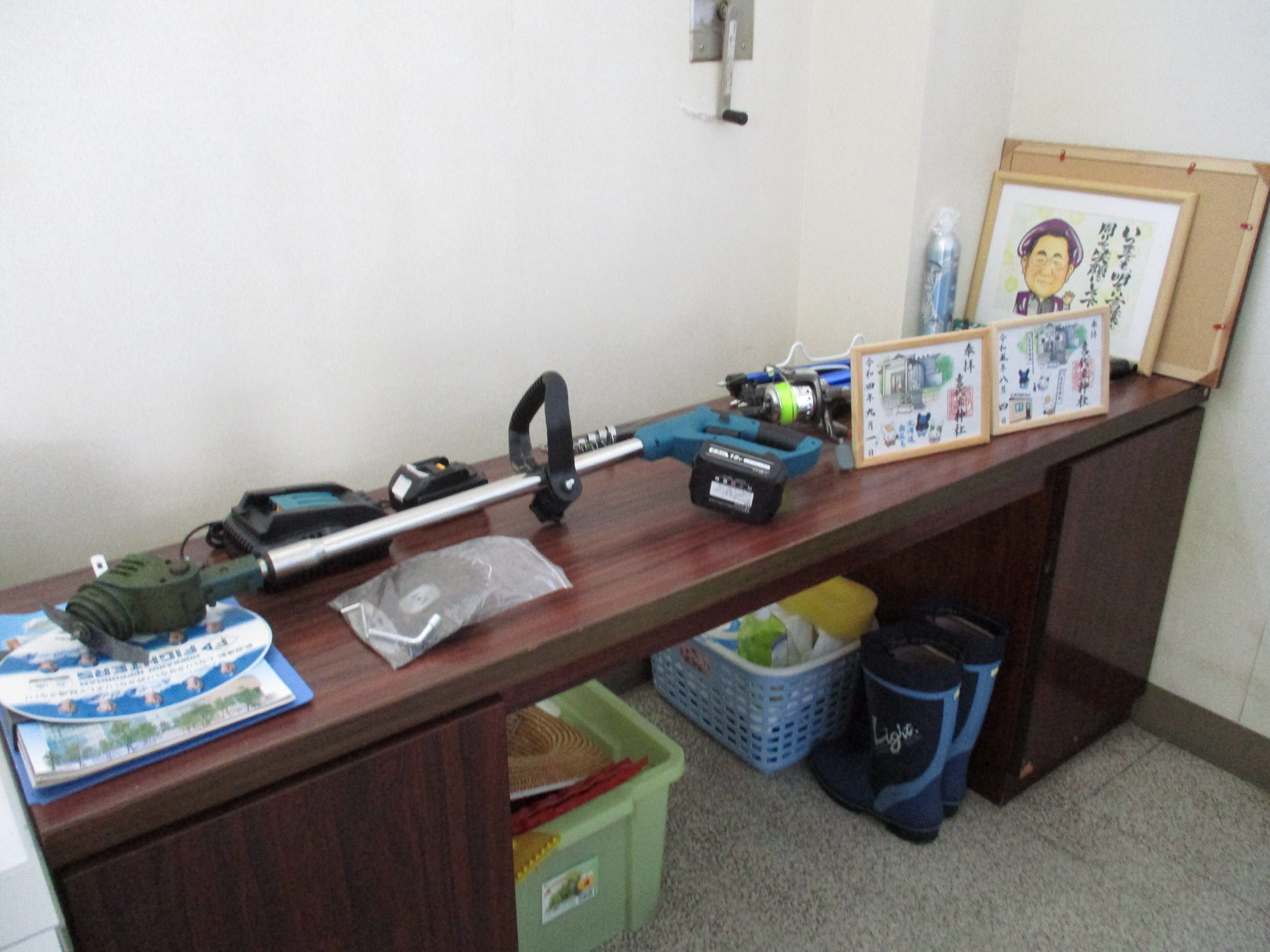 今晩は、私の趣味の紹介ですよ。電動式の草刈り機、釣竿、御朱印、似顔絵、会社の中にあります。今日も空き家の道路の片側の草を30分で、疲れました.年寄りの独り言ですが。明上雅孝.そば打ちセット、花火は別な場所にあります。笑えますか。