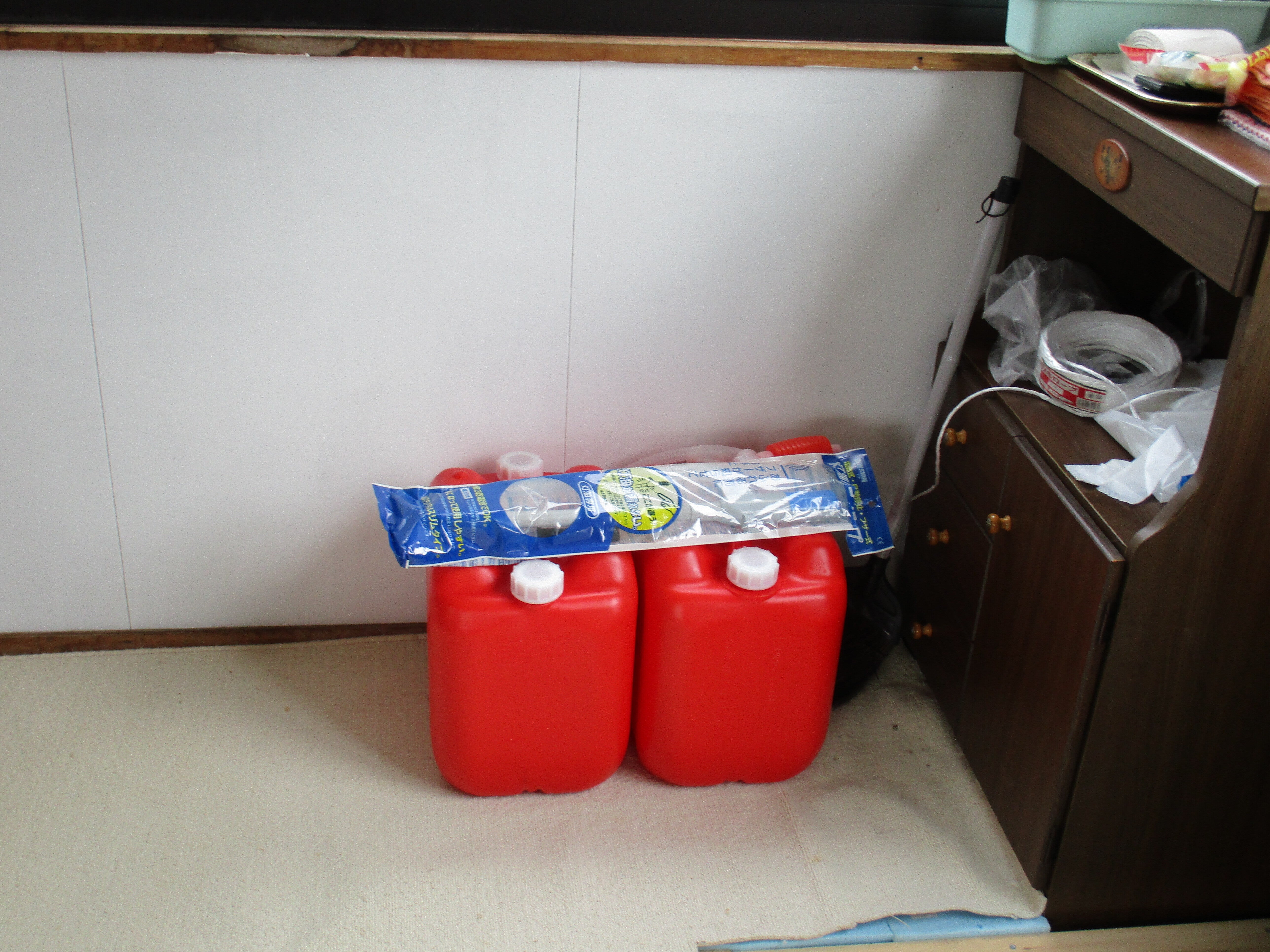 こんにちは、冬の為のポリタンクも用意出来ました。後は灯油を入れるだけです。置きストーブが2台あるので、12坪はクリアーです。地元の購入ですよ。提灯は島外の注文になりますが。明上雅孝。島は曇りの25度です、過ごしやすくなりました。イカはあまり取れません。