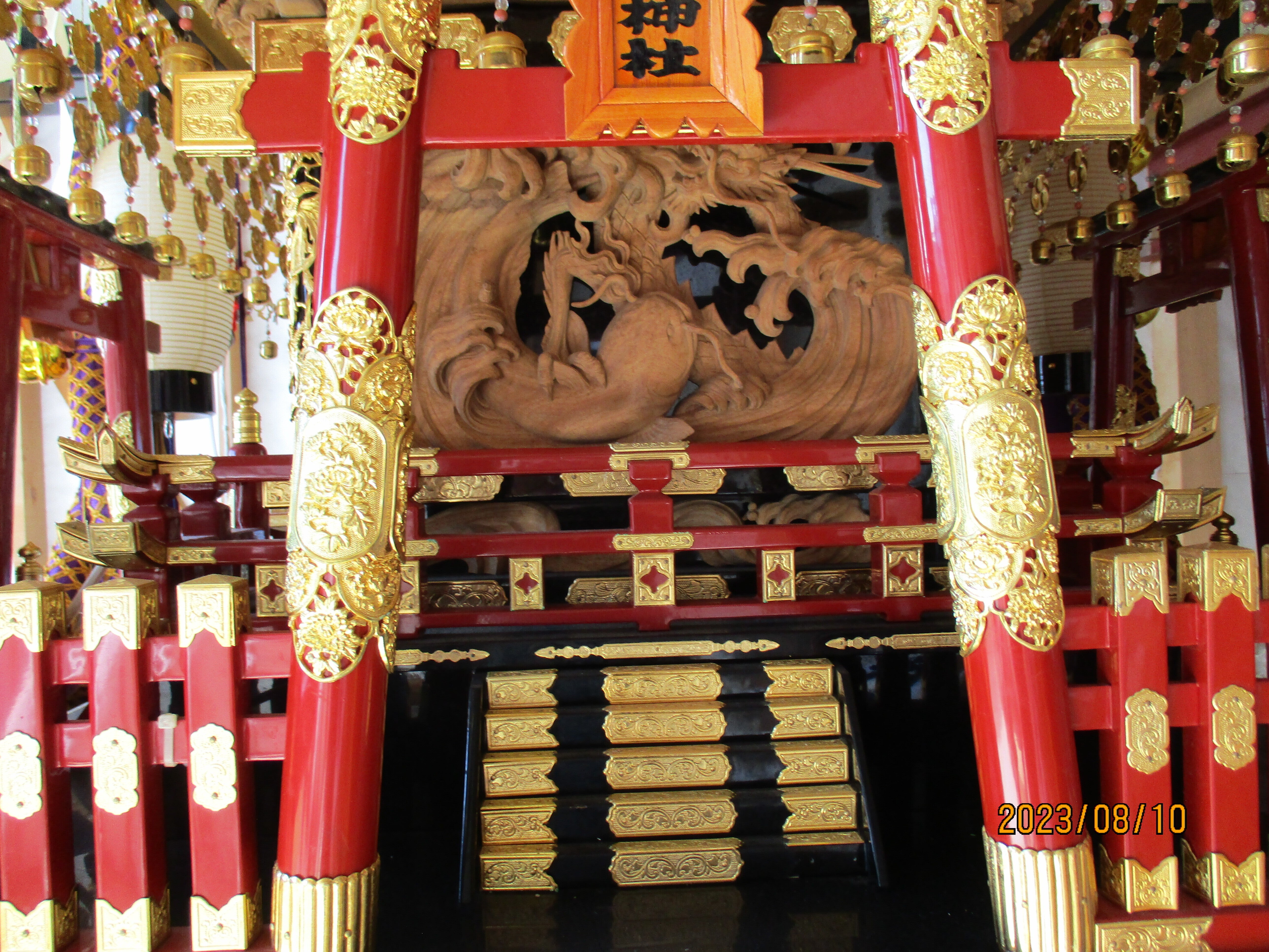 こんにちは、意外と知らない青苗のお神輿ですよ。平成13年に富山刑務所より購入しました、台車付きで850万でした、重さが600Kで担ぎ手30人が必要です。ナマズを龍が抑えています、彫刻入りです、南部白雲氏によるもので日本に一つの財産ですよ。明上雅孝.。