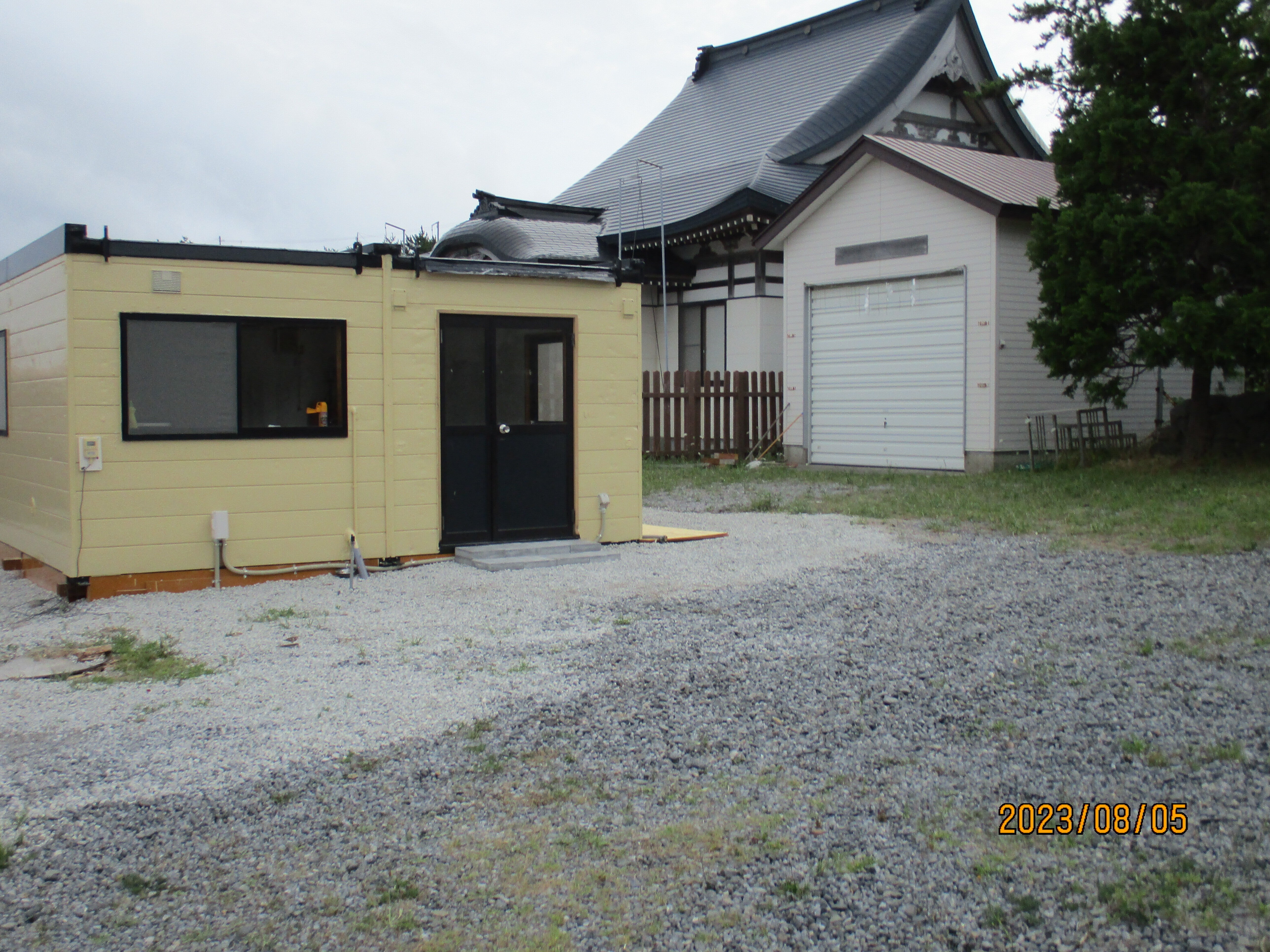こんにちは、クラウドファンディングの社務所の完成です、支援者の皆さんのお陰での事ですので、社務所に印を掲げます、明上雅孝.
