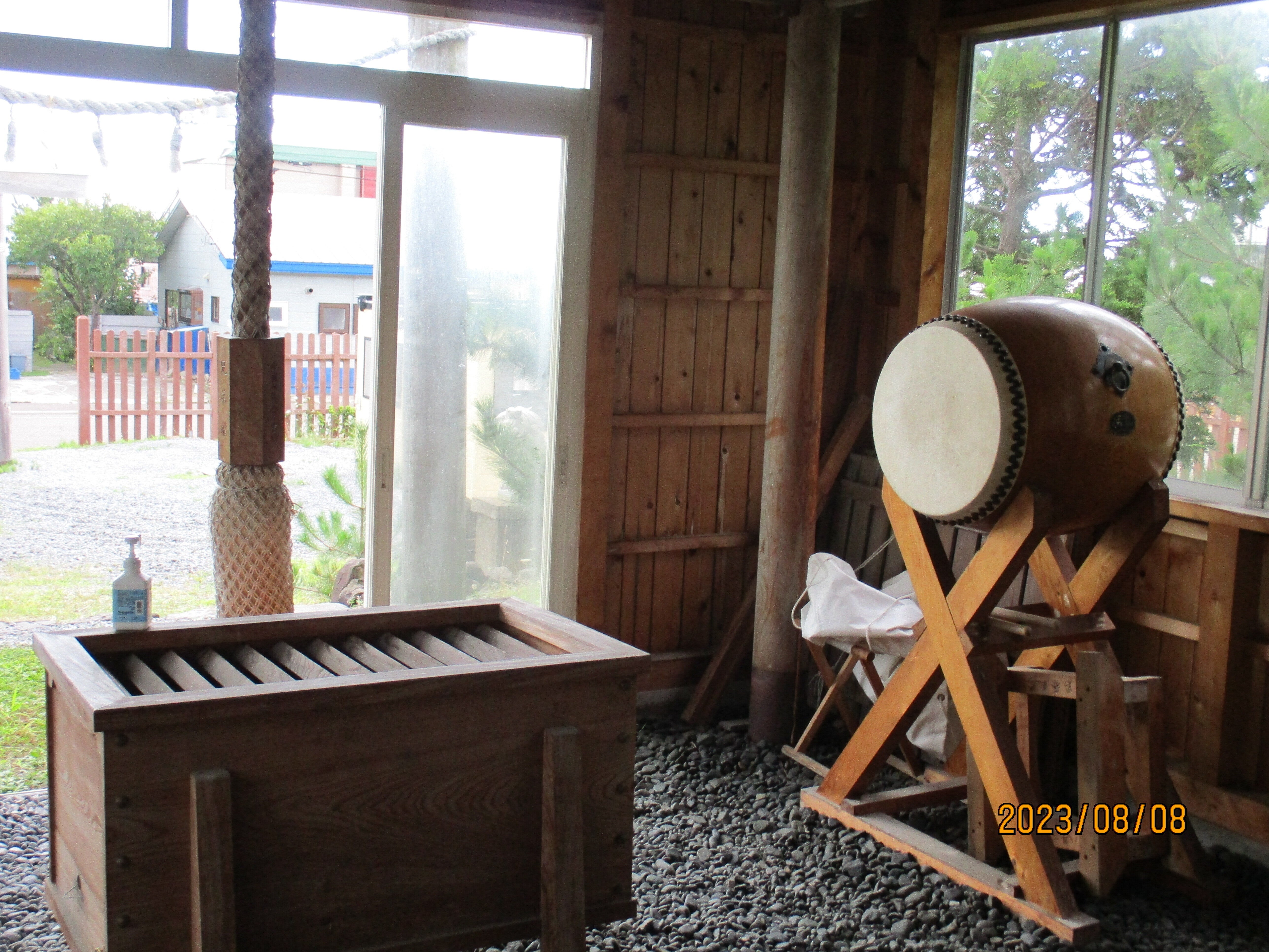こんにちは、例大祭の始めと終わりに叩く太鼓です、鈴は歌手の鳥羽一郎さんからの頂いたものです、平成8年です、名前、奉納、兄弟船と刻まれてます。音の嫌いなさい銭箱もあります。明上雅孝。お神輿も目の前に見られます、手で触れます。ナマズを龍が抑えています、地震を起こさぬように、地震災害から30年が経ちました。神社、お神輿、御朱印、クラウドファンディングの社務所の完成、7月からは観光の一つになり参拝も見られます。全てにおいて日本に一つの財産ですよ、090-5984-1384、あけがみまさたか、明上雅孝。