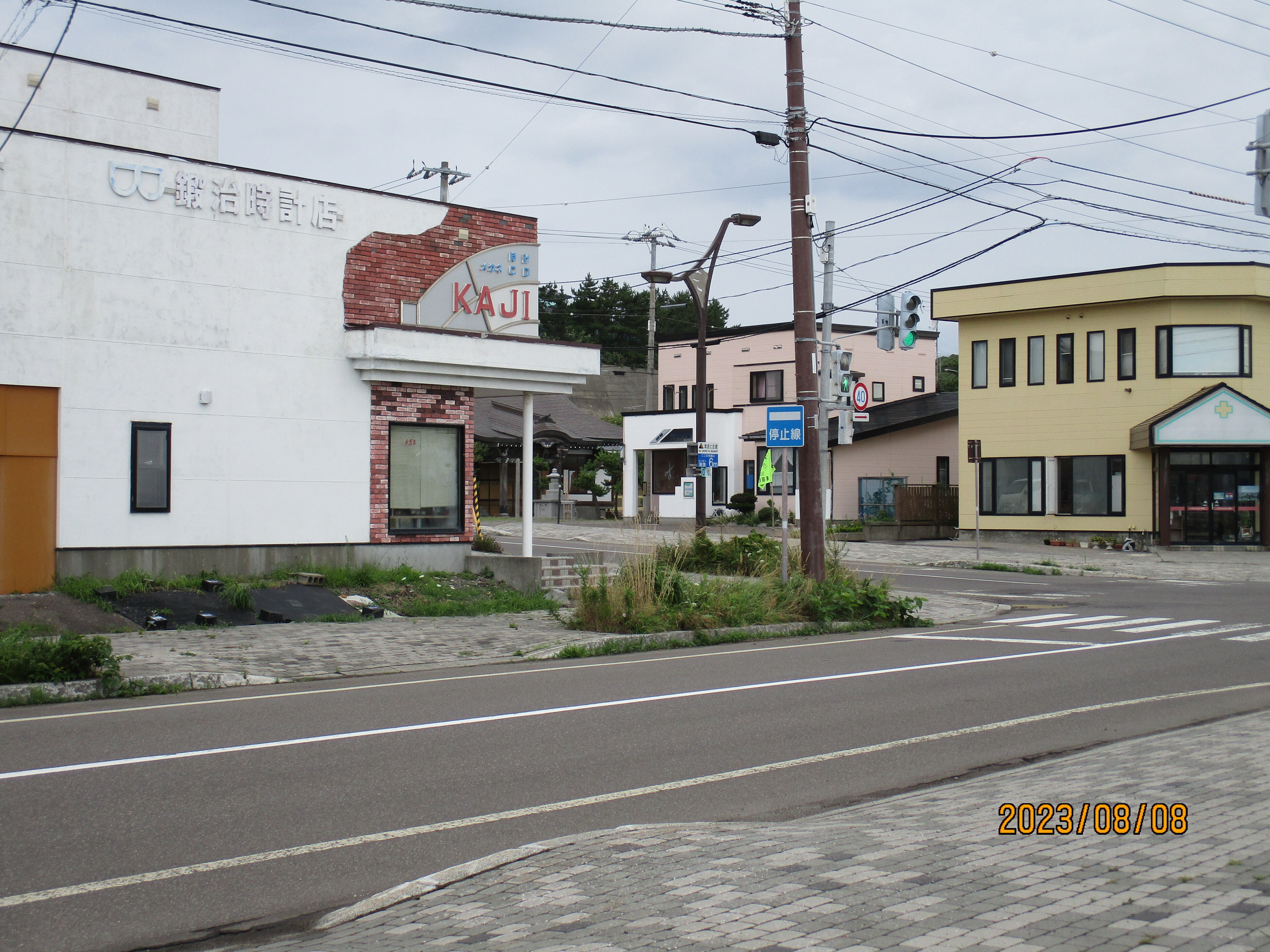 こんにちは、青苗の市街地です、自動の信号機はここだけです。商店も辞めてく店もあります、地震災害後に14軒で商店街を作りましたがそのうち半分は辞めました。人口の減少などで購買力も減りました。後継者不足もありますが。明上雅孝。