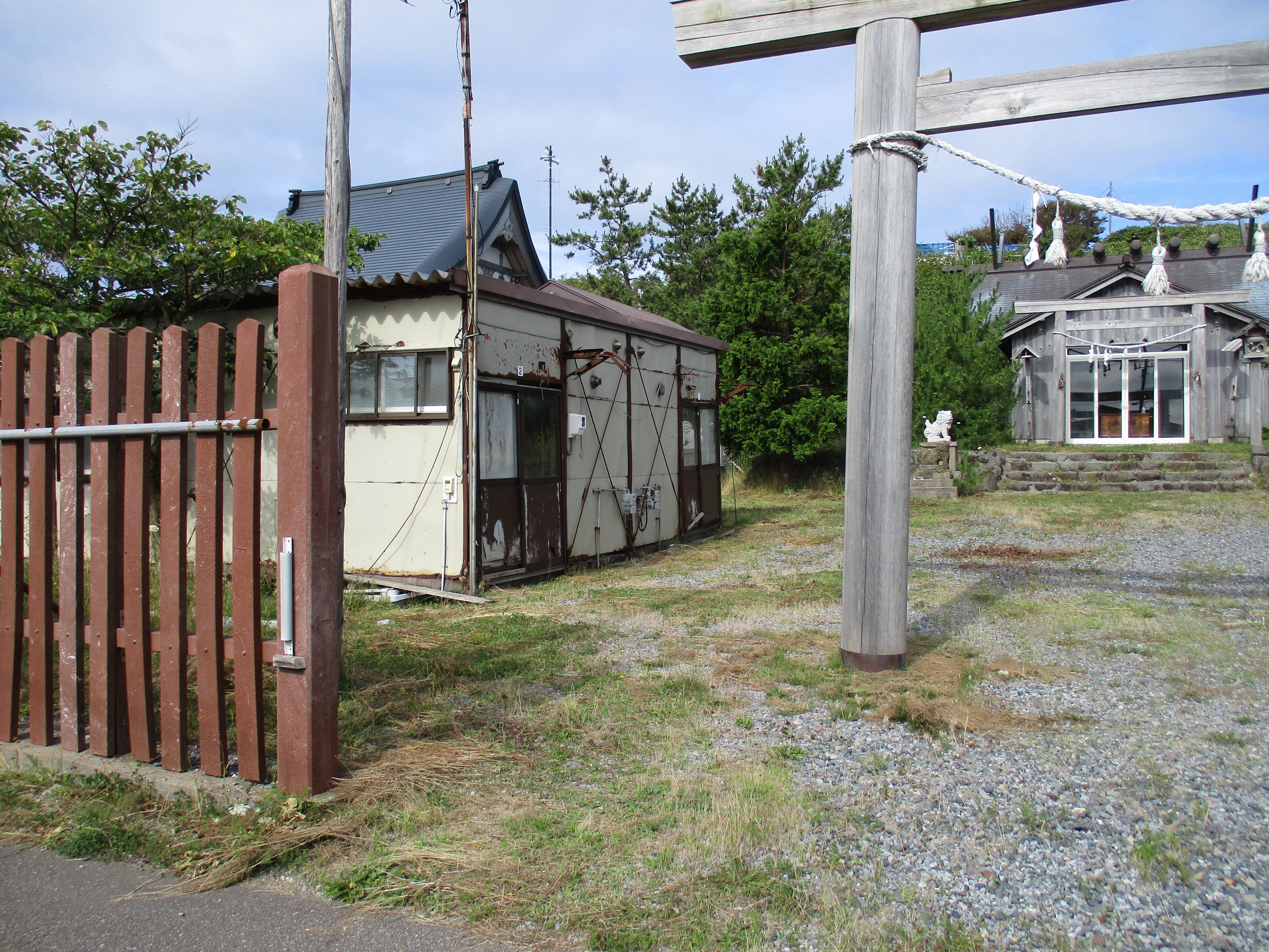 こんにちは、左に見えますのは前の社務所でした、28年も使いました、平成7年に地震災害の後に使用後の仮設住宅を頂いたと聞いています。9坪の背中合わせで18坪でした、今度の新しい社務所は12坪ですが大きさは十分ですよ。応接セットもおけました、有志からのプレゼントです。この他備品もプレゼントされました。よき仲間ですよ。23日には室津島の参拝があります、青苗港から4K離れた場所にある島です、人は住んでいません。太陽光の灯台がありますよ。明上雅孝。