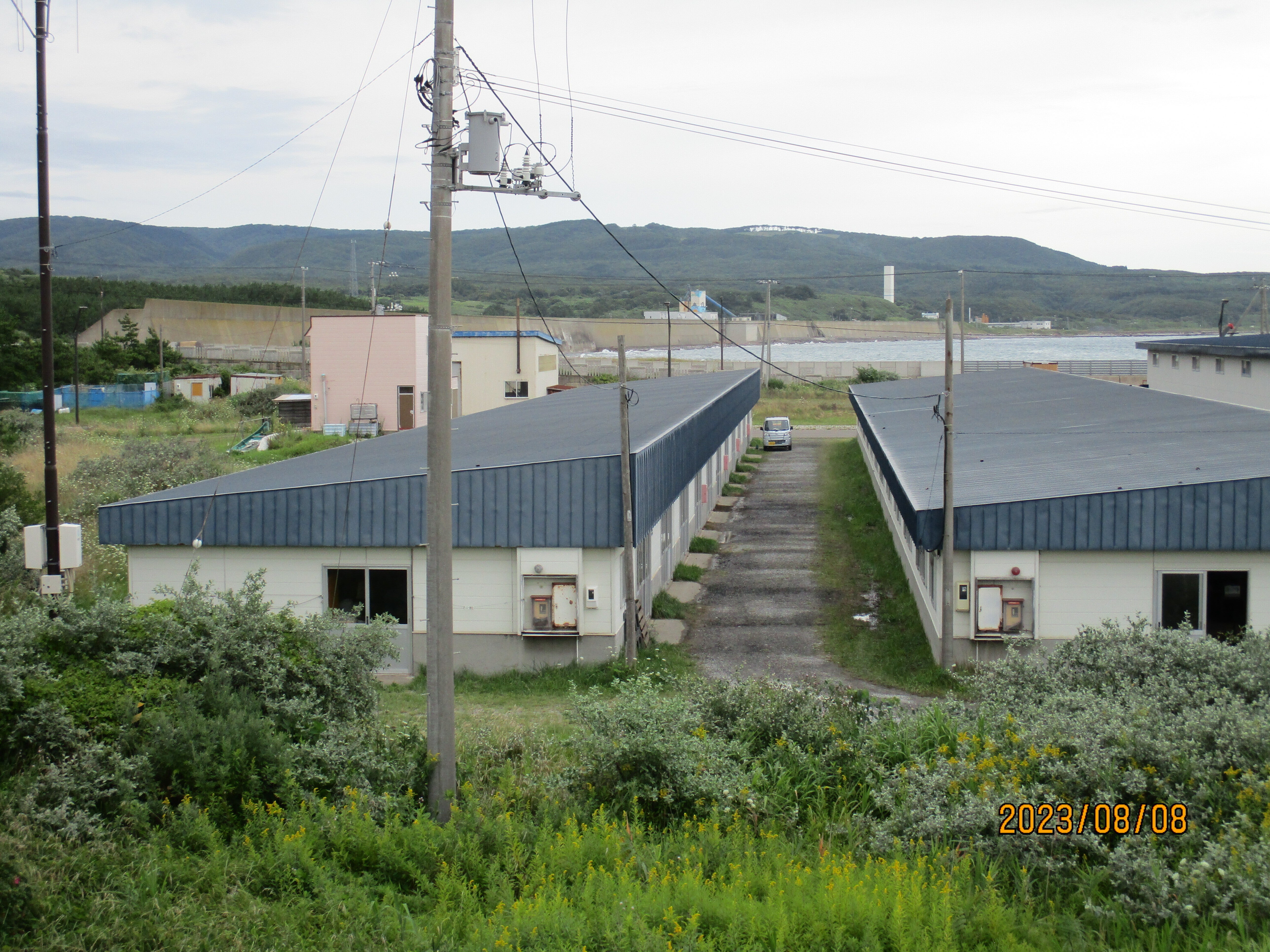 こんにちは、青苗のウニの工場です、12日までは頑張れます。今日もウニ取りが行われて賑わいがありました。まだまだ奥尻島は資源が豊富のようです。見えてる防潮堤は青苗の町に入る時の11メートルのコンクリートの防潮堤です、町の中は海抜6メートルです。下町は土盛を4メートルされてから、建設しています。お店、住宅などが。明上雅孝。
