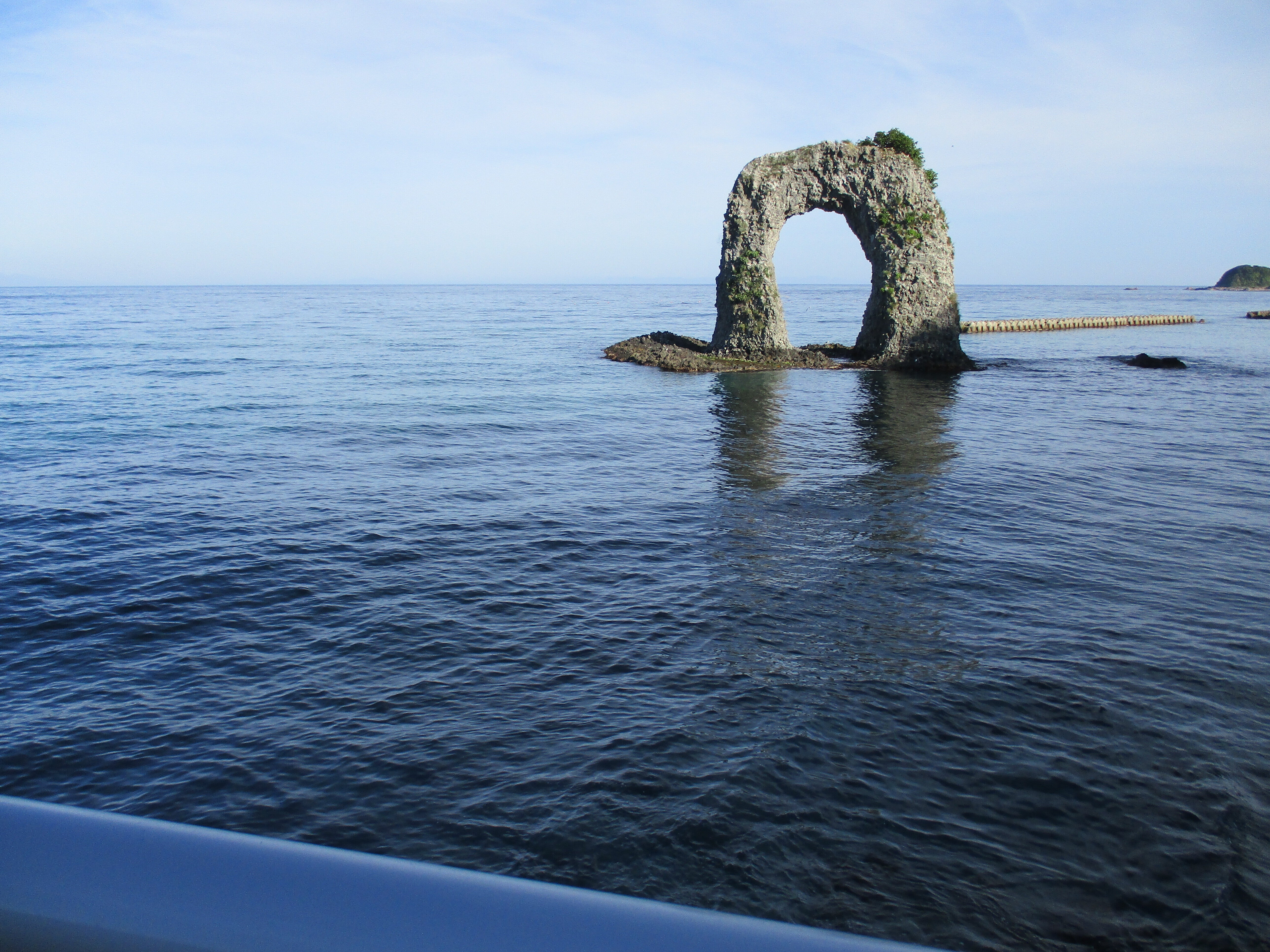 こんにちは、島のシンボルのなべつる岩です、鍋を持つときの手の事からきています、観光客の人気の高い所です、高さが18メートルで四季折々の花が咲きますよ。明上雅孝。