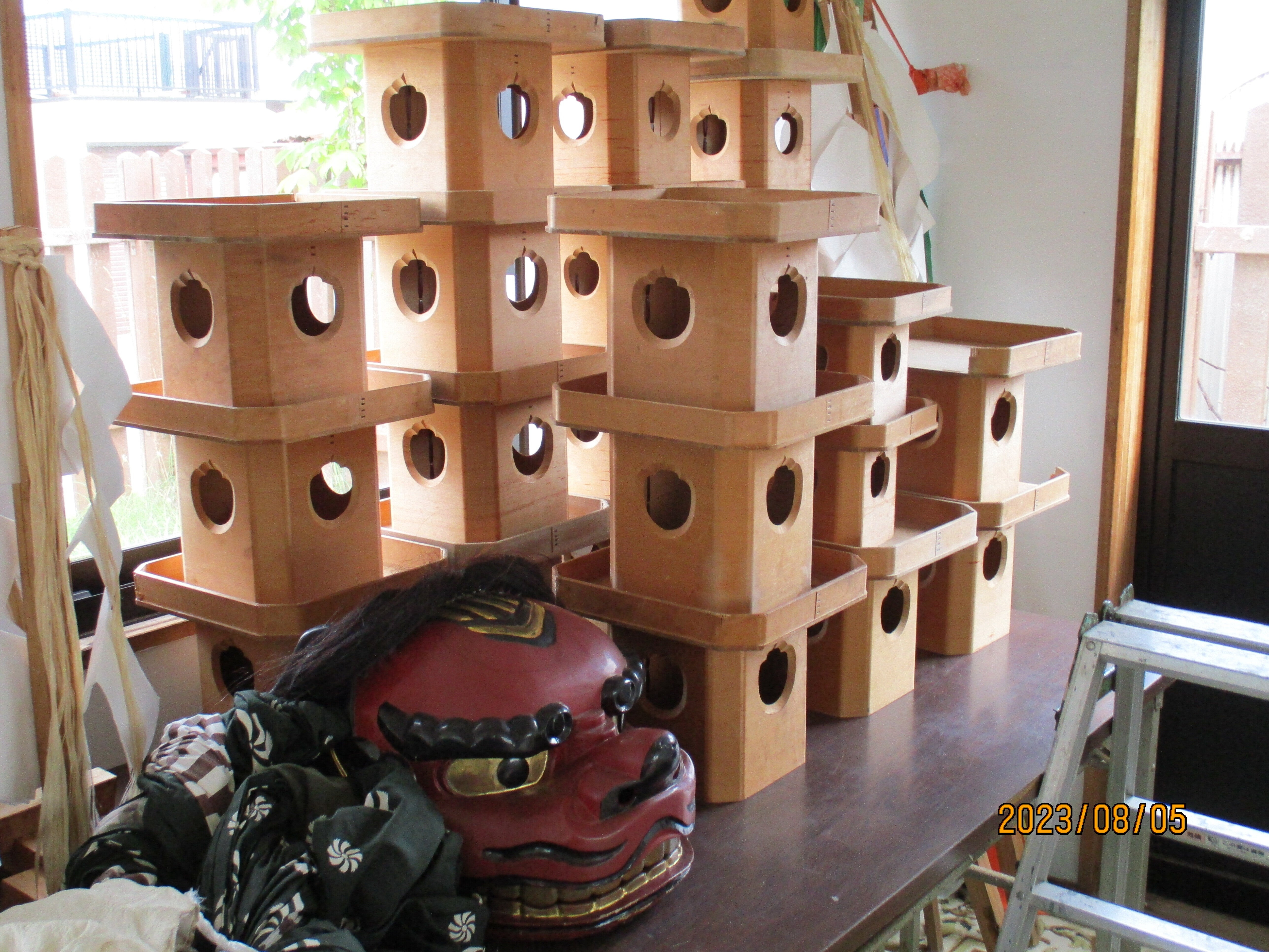 こんにちは、社務所の中の備品です、この獅子舞が踊られるのは、いつになるかな。高齢化の為に今年は、行列、お神輿、山車は町を練り歩くことは出来ません。歩けることを後世に期待しますよ。地域性もあるのかな。明上雅孝。