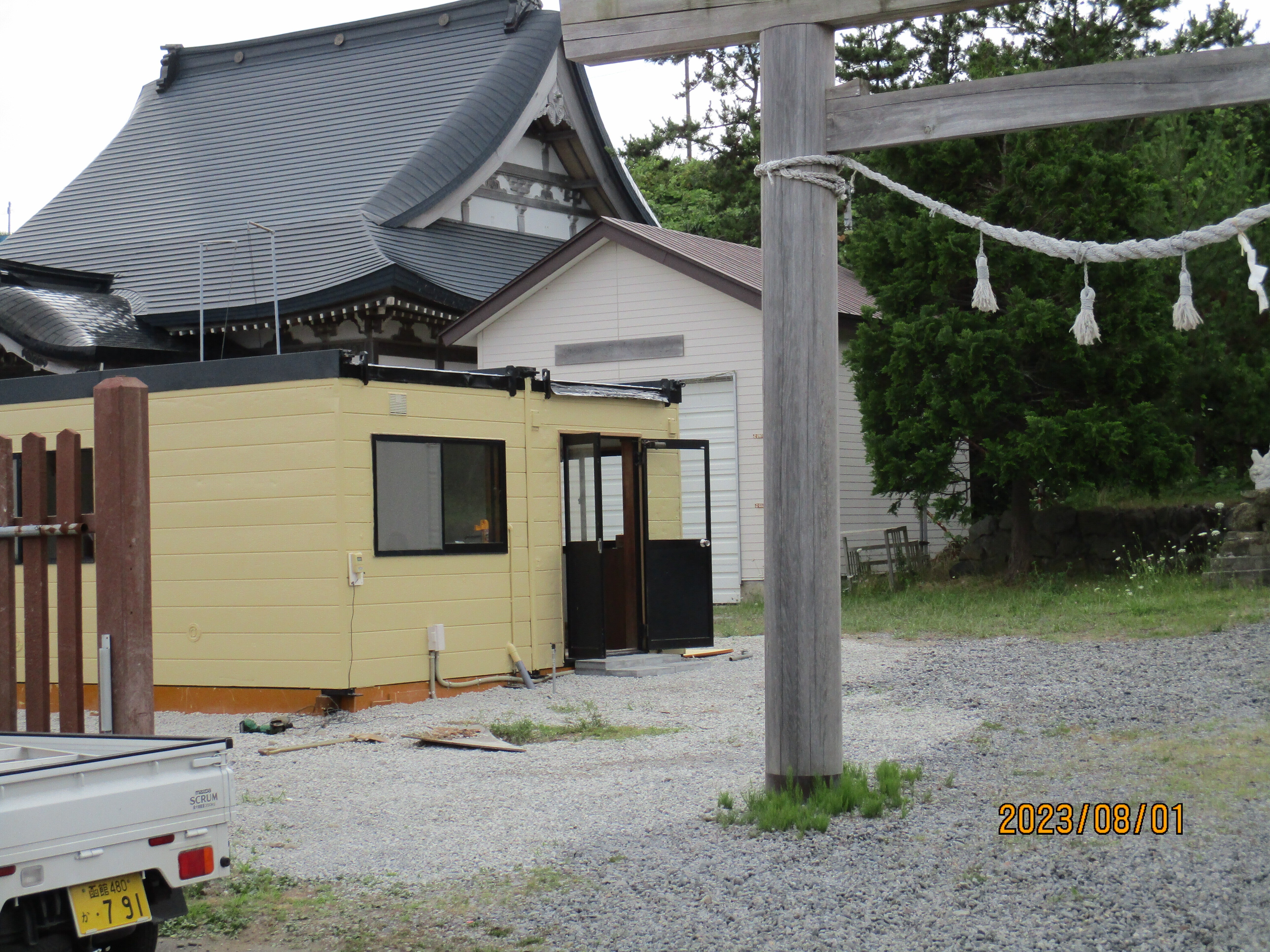 こんにちは、2日の写真です、参拝者も増えました、悩みがあります、トイレがありません、近所の家のトイレを借りていましたが、仮設トイレを置くことに考えました。宮司さんも安心と思います。仮設の汲み取り式ですが。今は性能がいい用ですよ。ご意見をお聞かせください。社務所も中古品でした。トイレも中古品でもいいものがあるとか、担当は有志の麓さんですよ。冠婚葬祭のプロです、素人ですが。有志の5人は、人柄がいいので、何とか支援金を50万円を助けてほしいとのことですよ。ご意見はいかがでしょうか。090-5984-1384、明上雅孝。観光客もトイレで困りますが。横に置くスペースはあります。