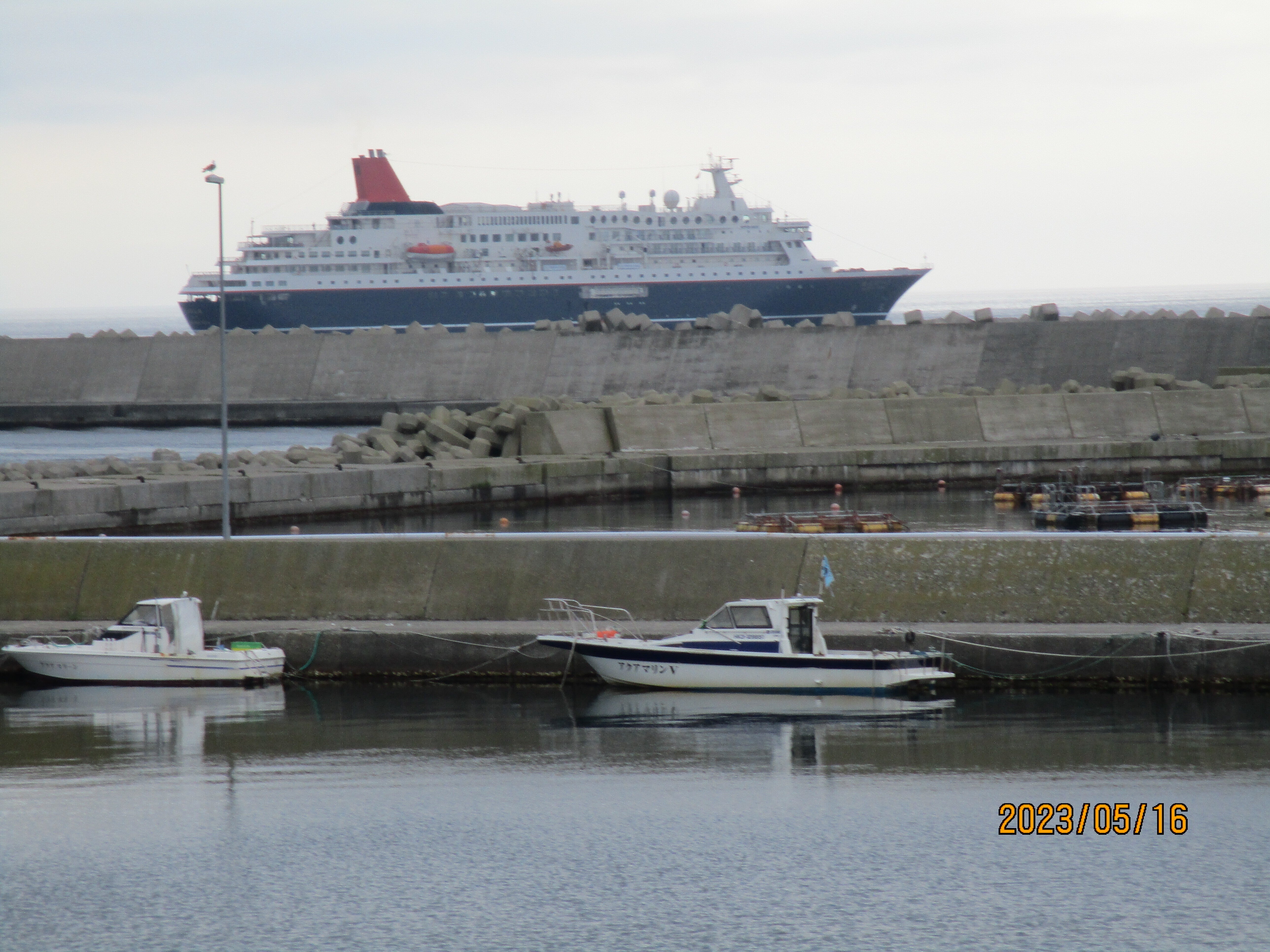 明日、入港予定のにっぽん丸ですよ。今年で3回目の予定です、明日の観光の為にバスが15日に島に渡りました。島にはバスがありません、もし、着岸出来れば経済が回ります、300人ほどが日本の奥尻島に上陸出来ますよ。明上雅孝.
