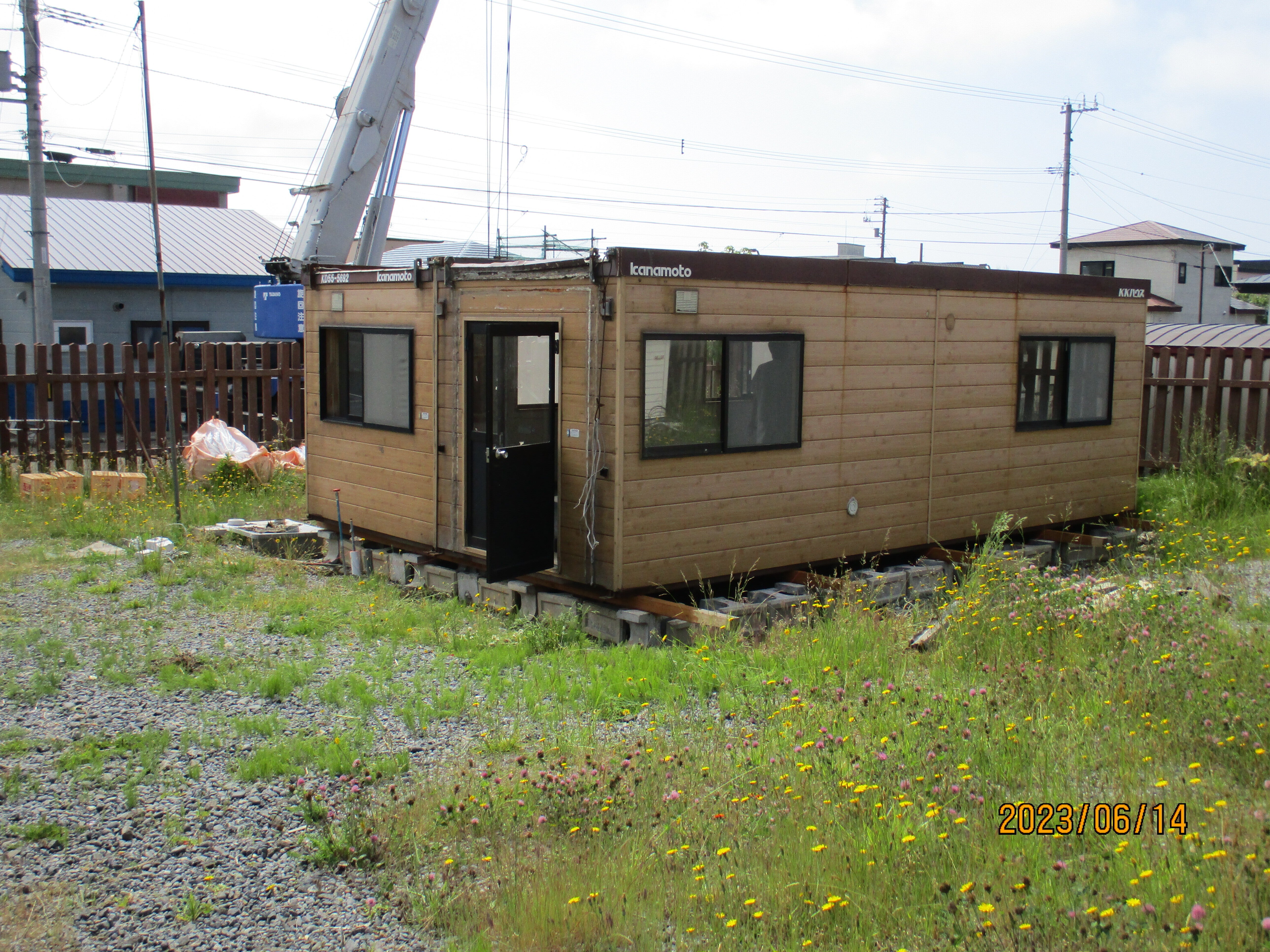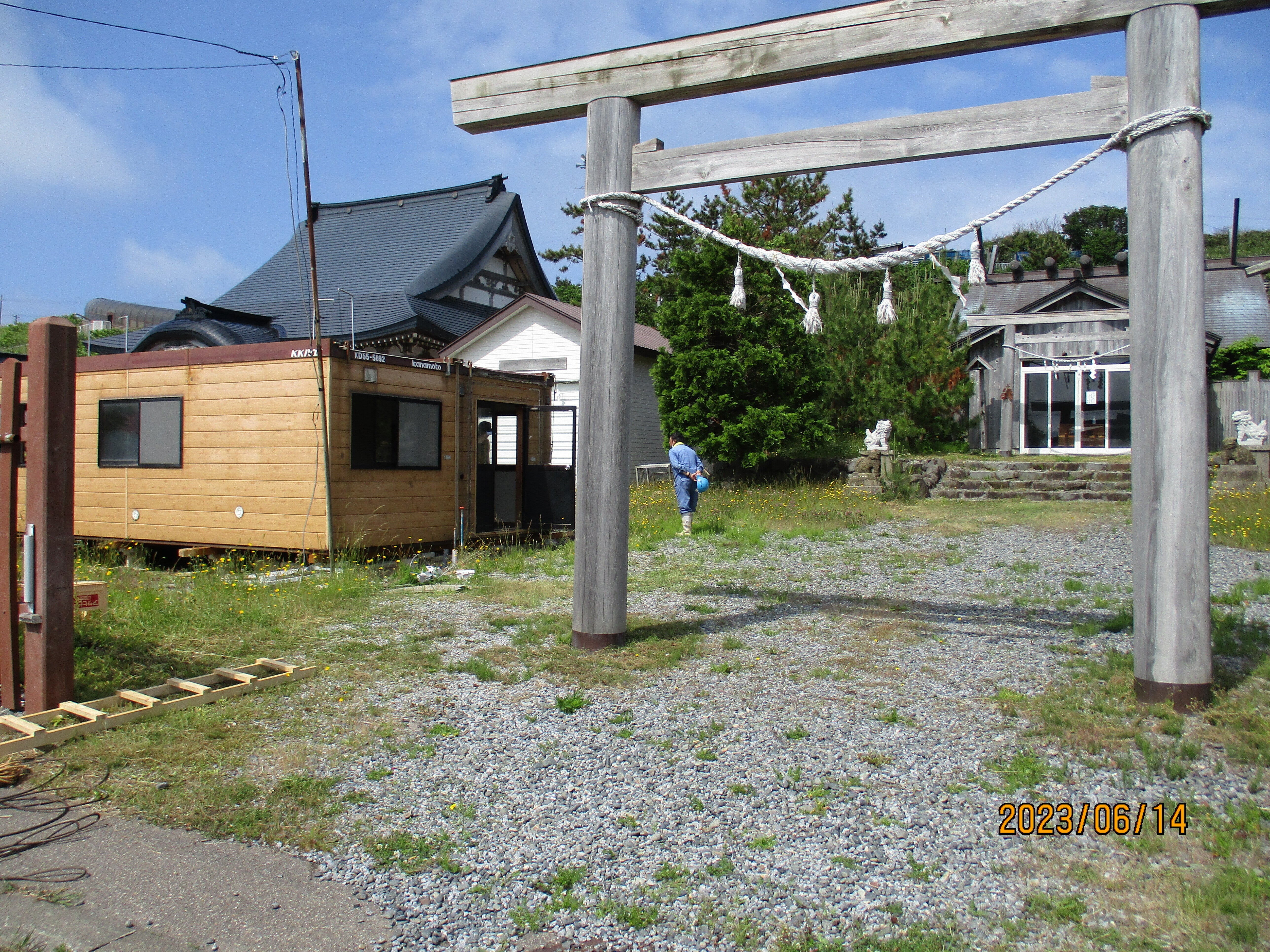 こんにちは、この日の設置を夢見てました、諦めないでよかったと。クレーンでおろし組み立てました。12坪のモバイルです、広さも十分ですよ、支援者の皆さんのお陰で青苗の事代主神社が、生き延びられましたよ。感謝、感謝、感謝。明上雅孝。090-5984-1384。
