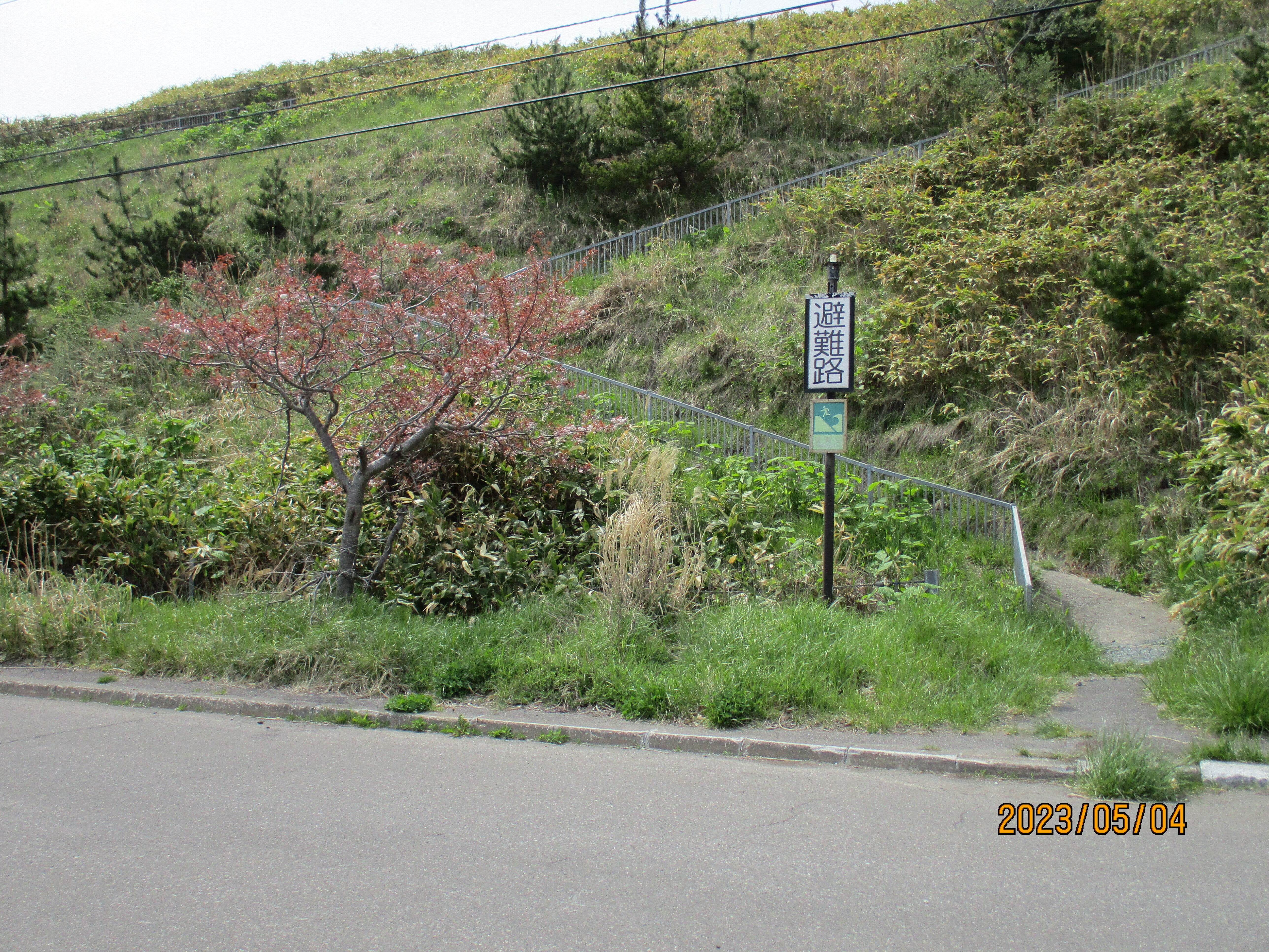 こんにちは、高台に逃げる避難路です、青苗地区は11本あります、勾配がきつく、高齢者は苦労してます、上り切れば海抜20メートルあるので一安心ですが。島の65歳以上は1000人を超えています、高齢化率は40パーセントを超えてます。明上雅孝。