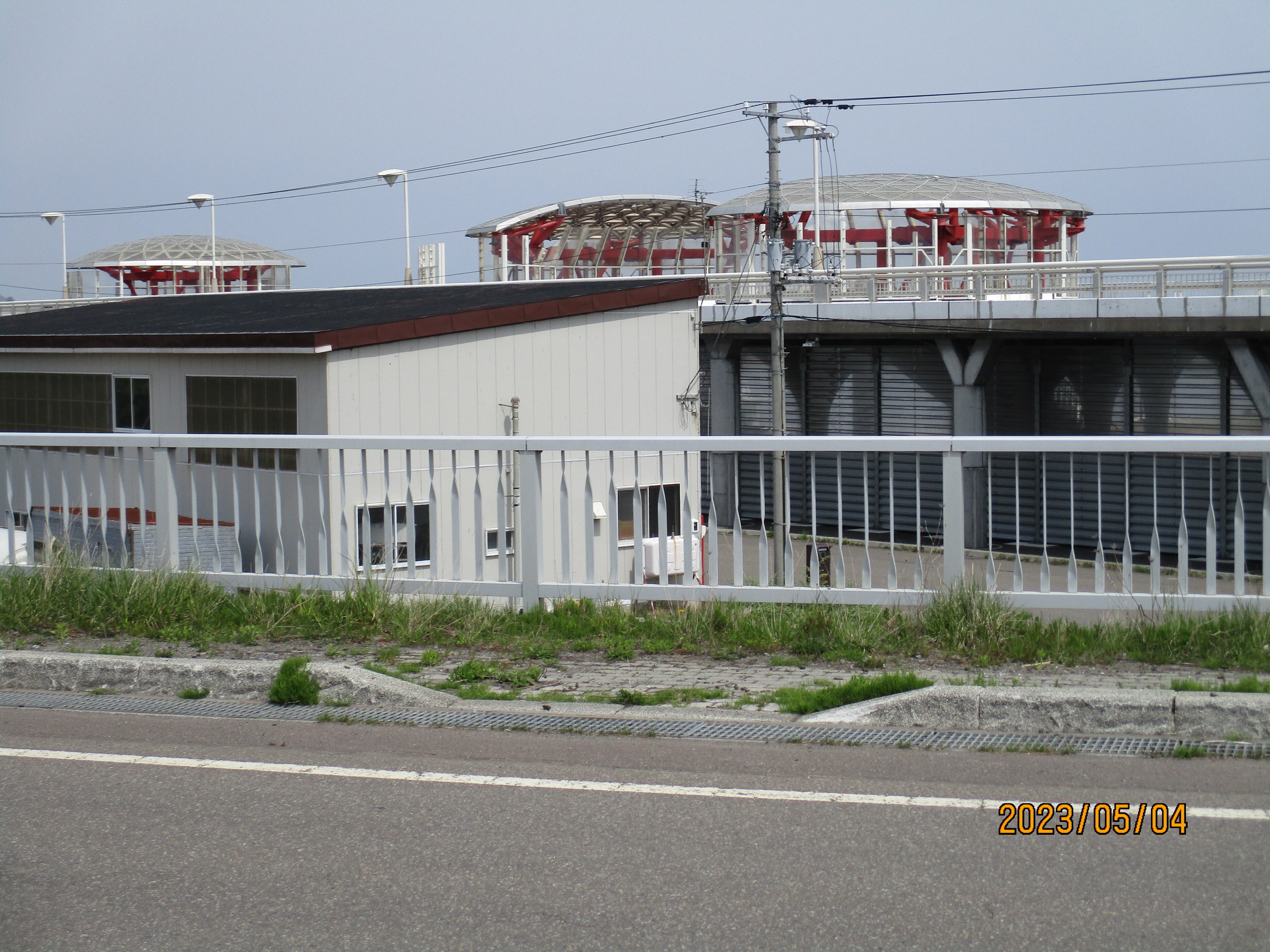 こんにちは、奥に見える丸いものは、地震災害により津波が来ることを予想し、逃げるのに作られた、避難場所の人工地盤のぼうかいきょうです。下からの5本の階段があり上に逃げます。海抜7,7メートルあります、2300人が収容出来ます、26億円で建設されました。縦、横のサイズはクルーズ船のにっぽん丸程の大きさです。イベントが雨の時は、下の場所で行います。雨除けになります。明上雅孝。