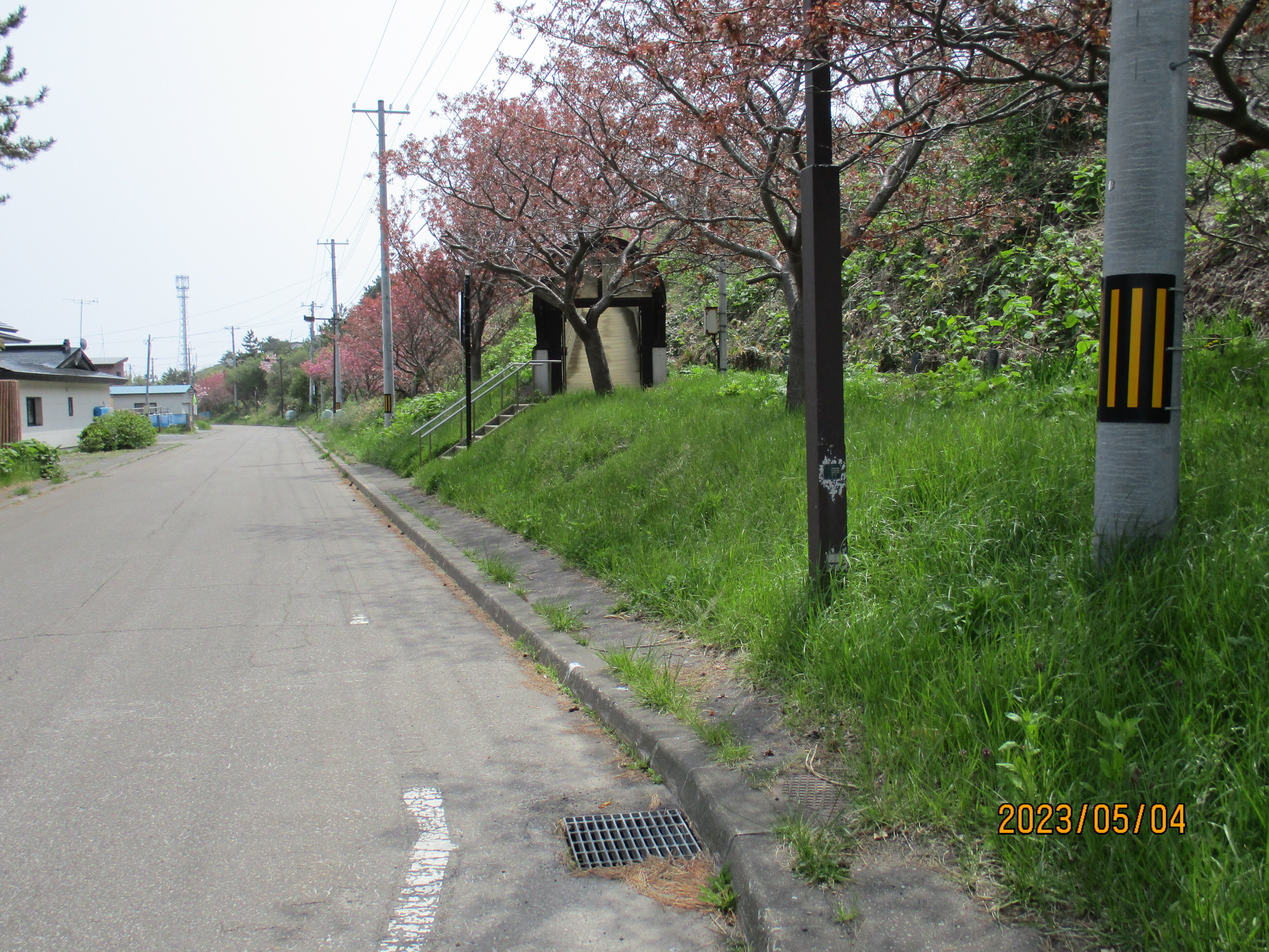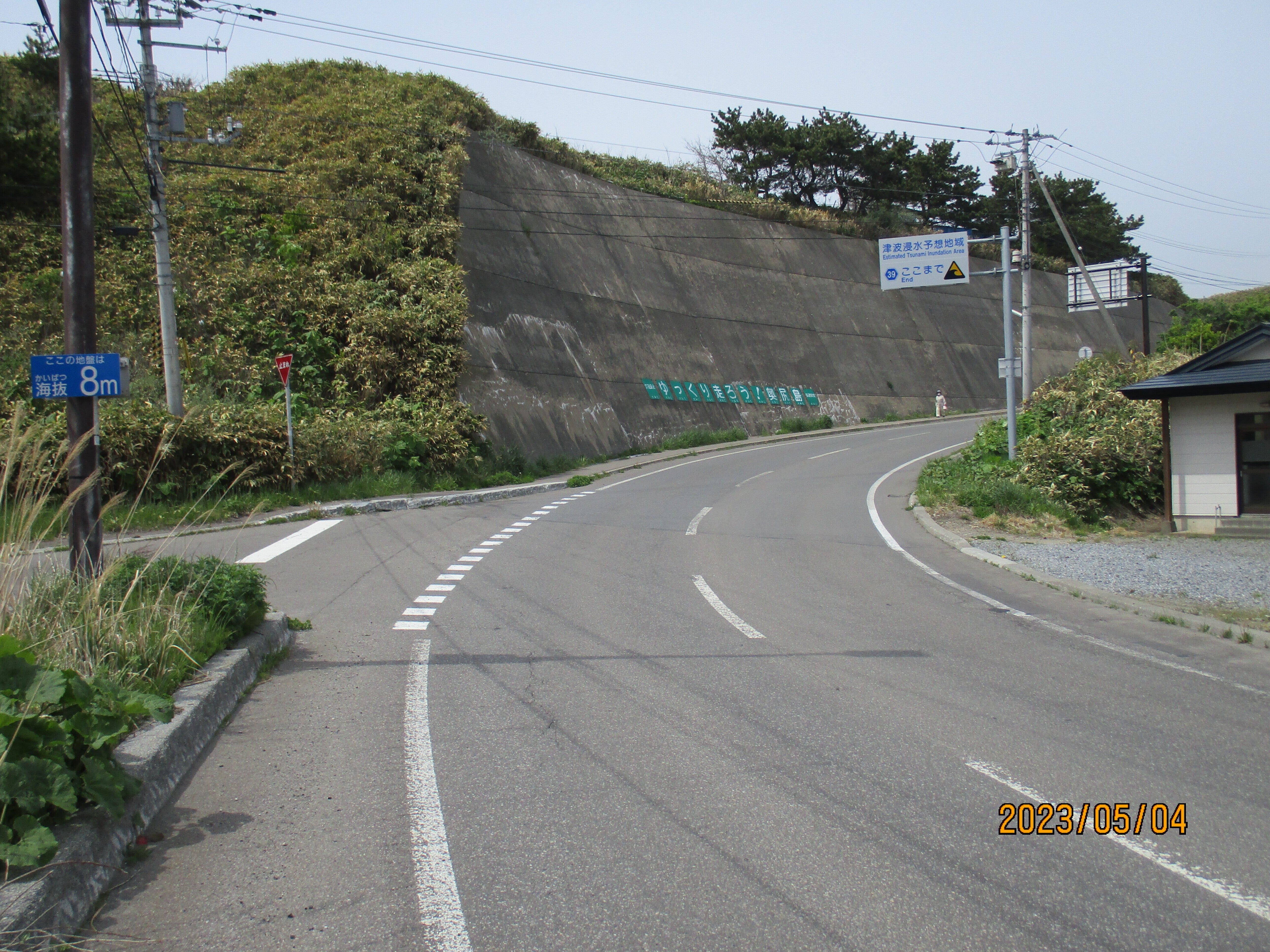 こんにちは、地震災害の時はこの坂を少し上れば命は助かりました、、津波は6メートルでした青苗地区は、左のコンクリートの上の部分が遺跡の勾玉の部分です、今は歴史を調べています。明上雅孝。