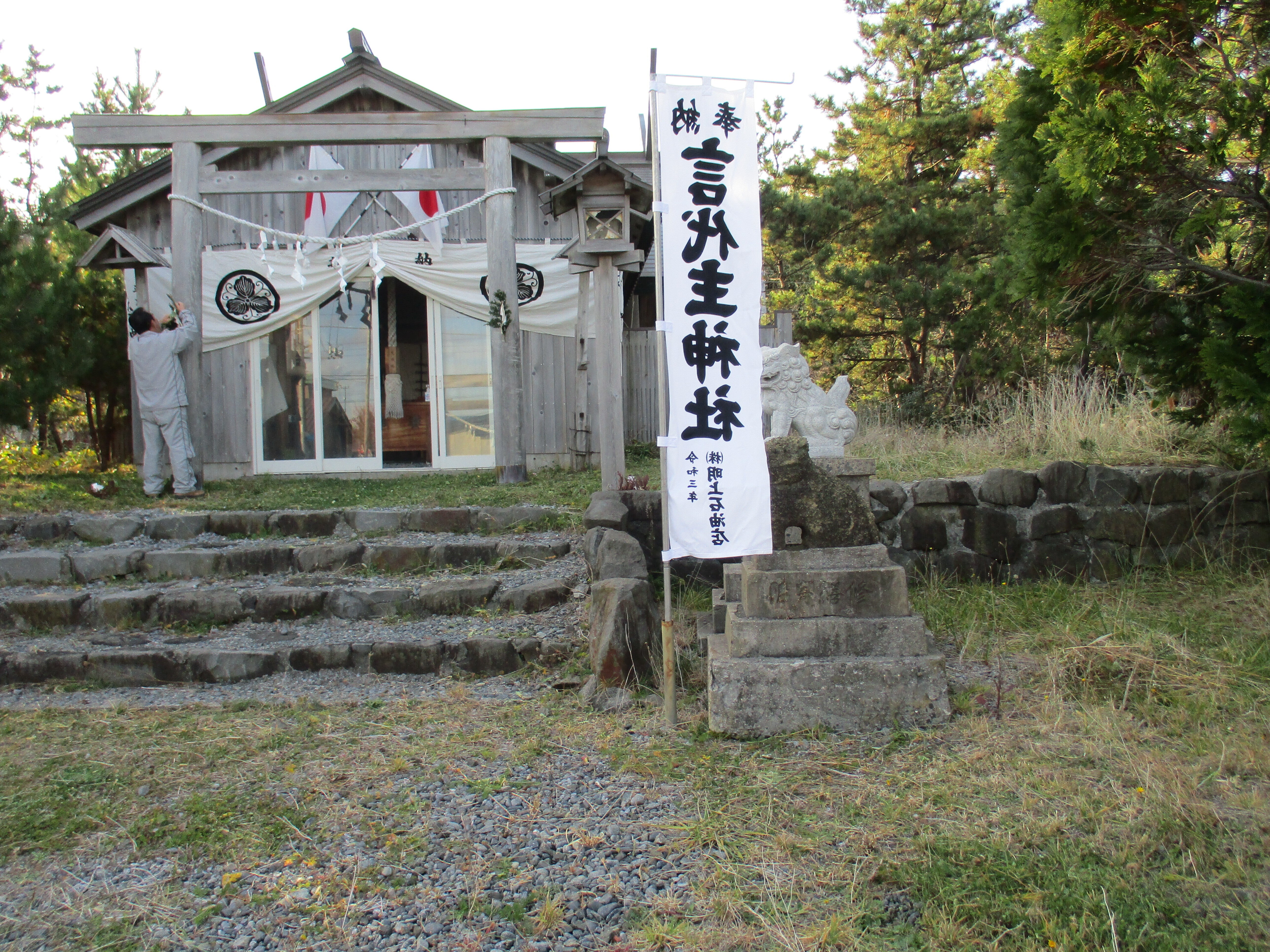 こんにちは、青苗の事代主神社です、5月31日には工事が完成します、伊勢神宮の式年遷宮で島にいただいた月讀み宮ですので、島の財産として、観光のお参りに、おこしください。今は支援金を募集しています、最後のお願いとなりますが、備品の購入に使うためです、支援金の40パーセントほどをお返し致します。ワインやお酒も返礼しています、礼状、御朱印は別便で送ります、由緒も。口座振り込みになりますが。090-5984-1384,明上雅孝。