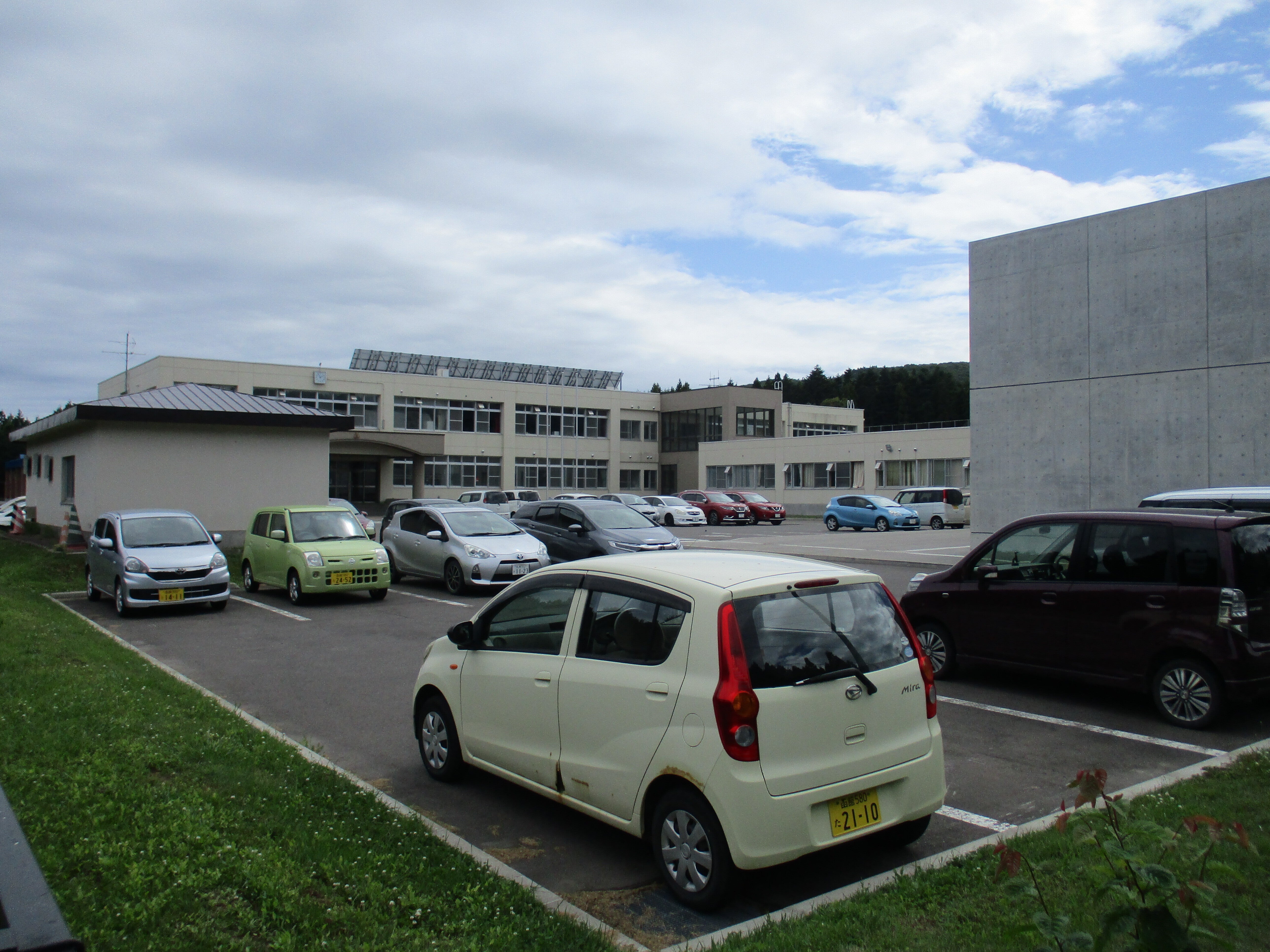 こんにちは、前に見えるのは奥尻高校です、今日は入学式です、島外からは10人の入学生です。地元は5人です、島での3年間を楽しんでいただければ嬉しいです。親御さんも来ています。晴れの入学式に。明上雅孝。