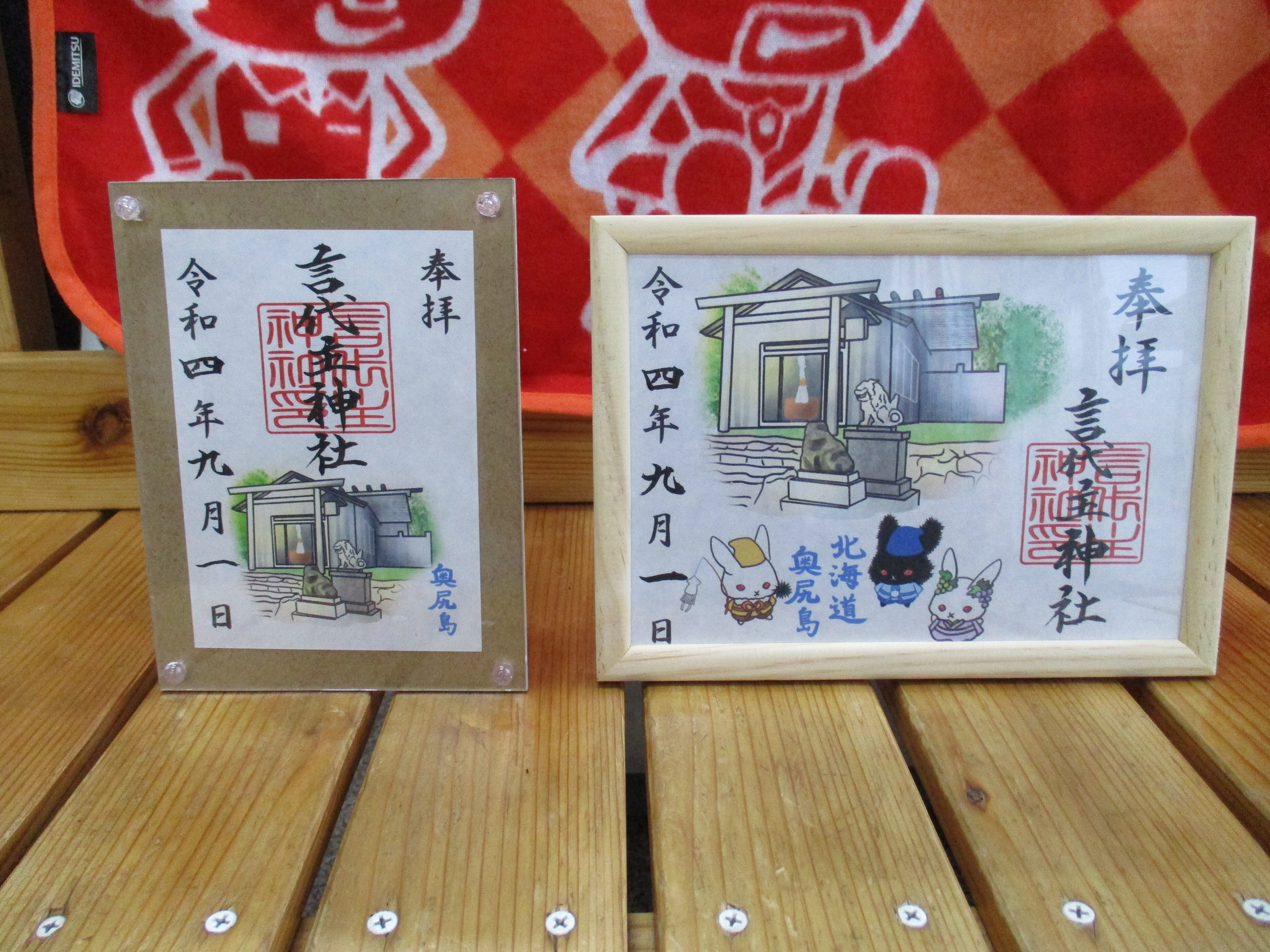 こんにちは、青苗の事代主神社です、琥珀アンダーソンさんに力を借りて初めての御朱印が出来ました。島にちなんで、イカ、ウニ、ブドウ、ウサギさんで締めました。可愛く出来感謝です。さすがにイラストレーターですね。明上雅孝。